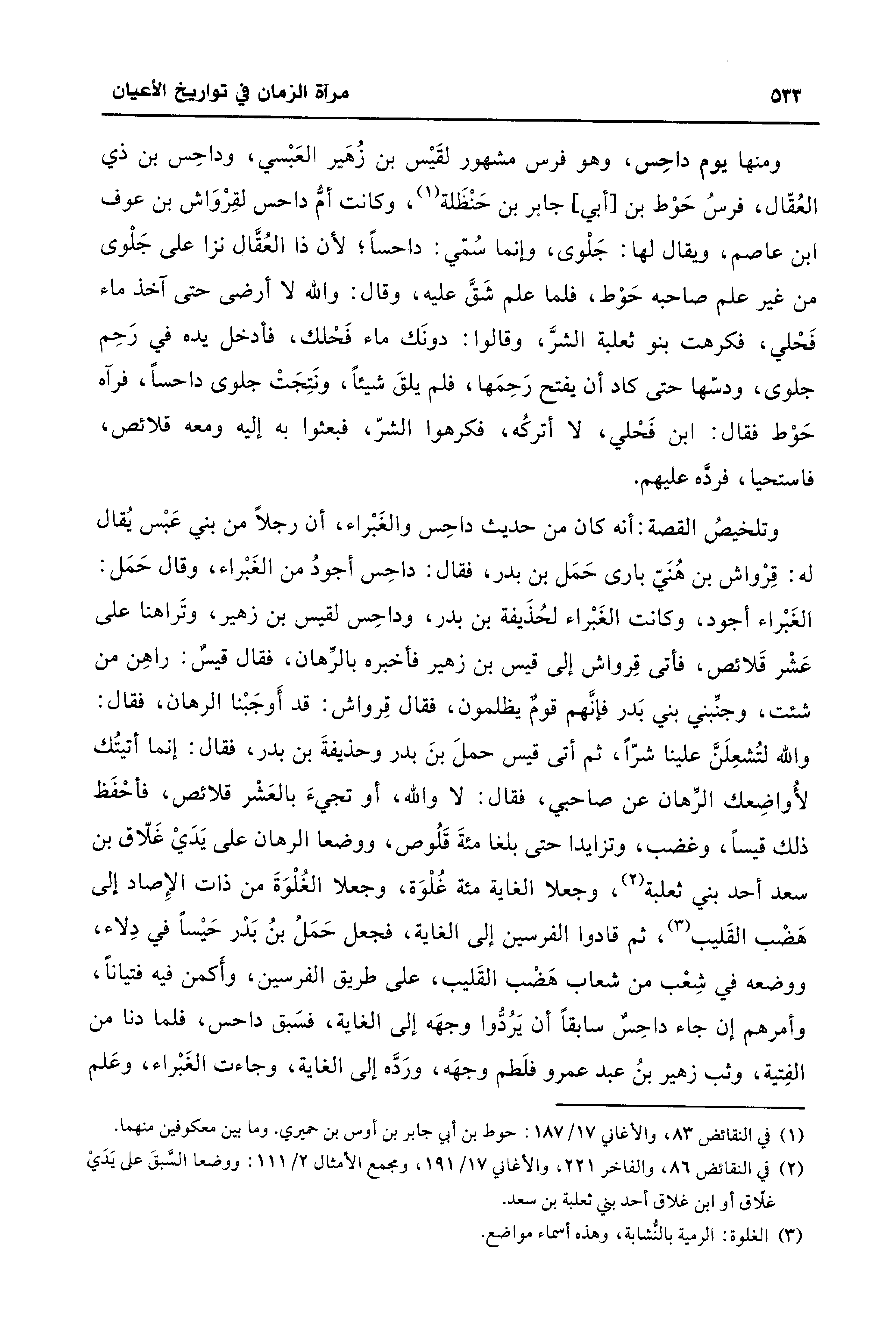 ومنها يوم داحِس، وهو فرس مشهور لقَيْس بن زُهَير العَبْسي، وداحِس بن ذي العُقّال، فرسُ حَوْط بن [أبي] جابر بن حَنْظَلة (¬1)، وكانت أمُّ داحس لقِرْوَاش بن عوف ابن عاصم، ويقال لها: جَلْوى، وإنَّما سُمّي: داحساً؛ لأنَّ ذا العُقَّال نزا على جَلْوى من غير علم صاحبه حَوْط، فلما علم شَقَّ عليه، وقال: والله لا أرضى حتَّى آخذ ماء فَحْلي، فكرهت بنو ثعلبة الشرَّ، وقالوا: دونَك ماء فَحْلك، فأدخل يده في رَحِم جلوى، ودسّها حتَّى كاد أن يفتح رَحِمَها، فلم يلقَ شيئًا، ونَتِجَتْ جلوى داحساً، فرآه حَوْط فقال: ابن فَحْلي، لا أتركُه، فكرهوا الشرّ، فبعثوا به إليه ومعه قلائص، فاستحيا، فردَّه عليهم.