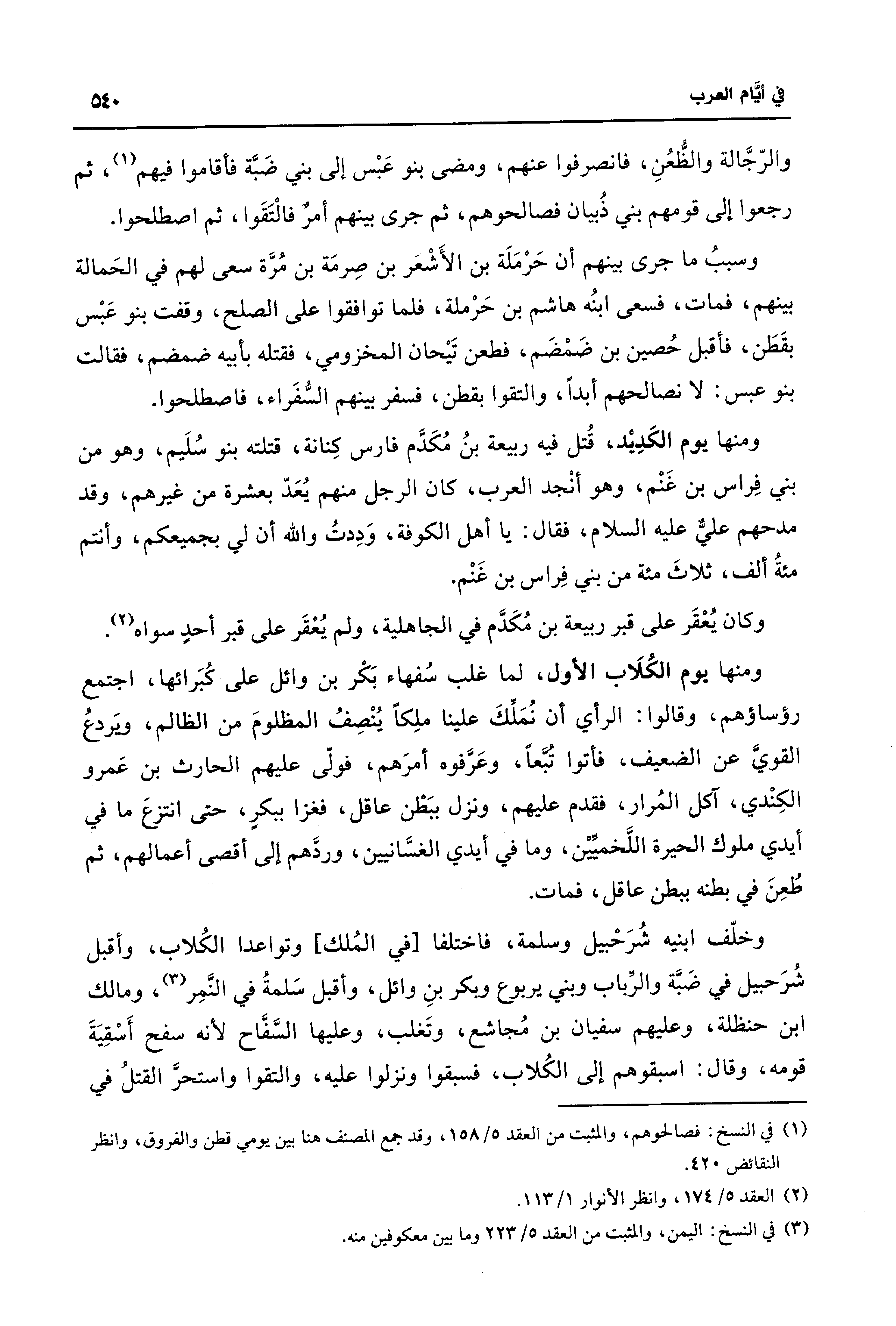 وخلّف ابنيه شُرَحْبيل وسلمة، فاختلفا [في المُلك] وتواعدا الكُلاب، وأقبل شُرَحبيل في ضَبة والرباب وبني يربوع وبكر بنِ وائل، وأقبل سَلمةُ في النَّمِر (¬3)، ومالك ابن حنظلة، وعليهم سفيان بن مُجاشع، وتَغلب، وعليها السَّفَّاح لأنَّه سفح أَسْقِيَةَ قومه، وقال: اسبقوهم إلى الكُلاب، فسبقوا ونزلوا عليه، والتقوا واستحرَّ القتلُ في