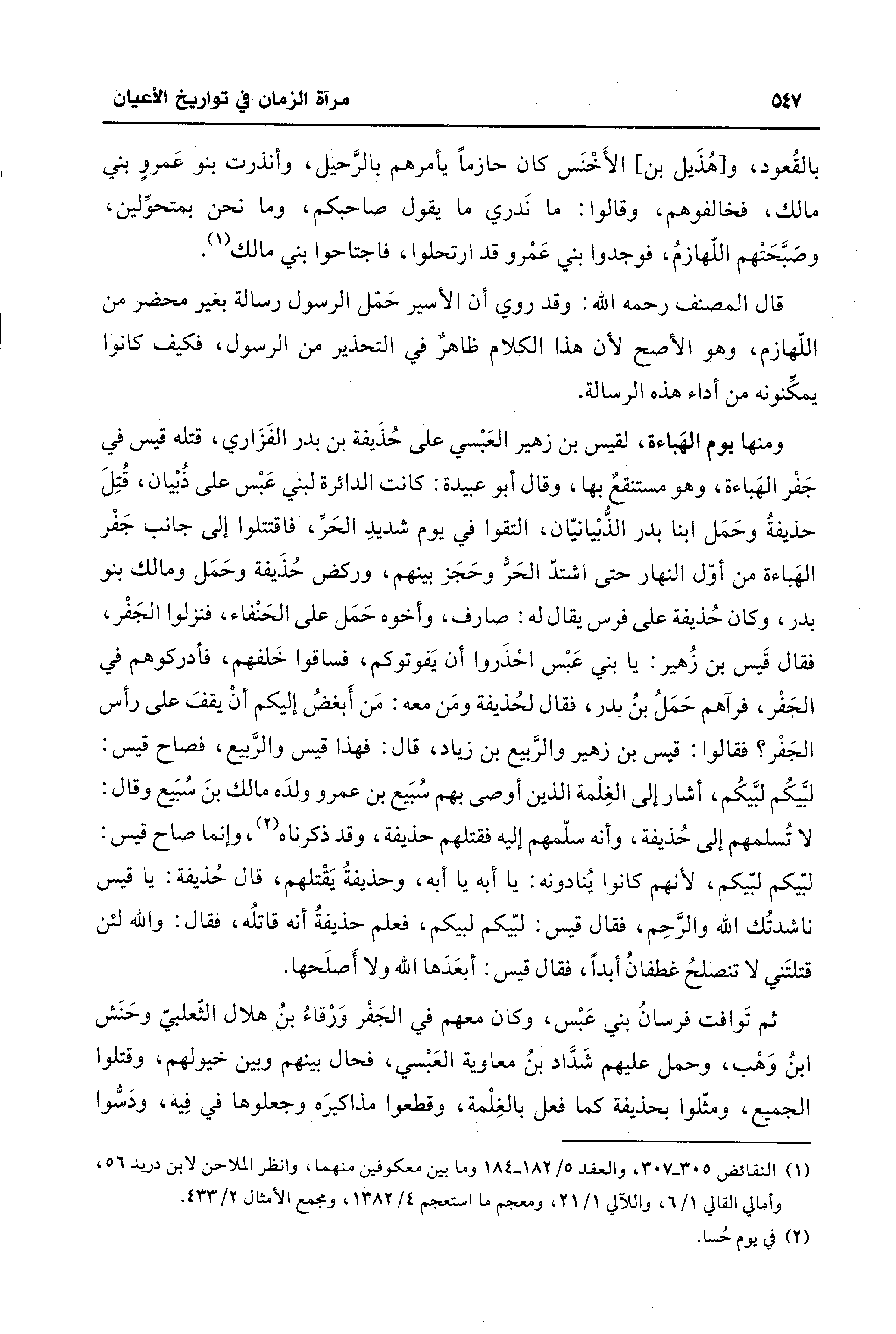 ومنها يوم الهَباءة، لقيس بن زهير العَبْسي على حُذَيفة بن بدر الفَزَاري، قتله قيس في جَفْر الهَباءة، وهو مستنقعٌ بها، وقال أبو عبيدة: كانت الدائرة لبني عَبْس على ذُبْيان، قُتِلَ حذيفةُ وحَمَل ابنا بدر الذُّبْيانيّان، التقوا في يوم شديدِ الحَرِّ، فاقتتلوا إلى جانب جَفْر الهَباءة من أوّل النهار حتَّى اشتدّ الحَرُّ وحَجَز بينهم، وركض حُذَيفة وحَمَل ومالك بنو بدر، وكان حُذيفة على فرس يقال له: صارف، وأخوه حَمَل على الحَنْفاء، فنزلوا الجَفْر، فقال قَيس بن زُهير: يا بني عَبْس احْذَروا أن يَفوتوكم، فساقوا خَلفهم، فأدركوهم في الجَفْر، فرآهم حَمَلُ بنُ بدر، فقال لحُذيفة ومَن معه: مَن أَبغضُ إليكم أنْ يقفَ على رأس الجَفْر؟ فقالوا: قيس بن زهير والرَّبيع بن زياد، قال: فهذا قيس والرَّبيع، فصاح قيس: لبَّيكُم لبَّيكُم، أشار إلى الغِلْمة الذين أوصى بهم سُبَيع بن عمرو ولدَه مالك بنَ سُبَيع وقال: لا تُسلمهم إلى حُذيفة، وأنه سلّمهم إليه فقتلهم حذيفة، وقد ذكرناه (¬2)، وإنَّما صاح قيس: لبّيكم لبّيكم، لأنهم كانوا يُنادونه: يا أبه يا أبه، وحذيفةُ يَقْتلهم، قال حُذيفة: يا قيس ناشدتُك الله والرَّحِم، فقال قيس: لبّيكم لبّيكم، فعلم حذيفةُ أنَّه قاتلُه، فقال: والله لئن قتلتَني لا تنصلحُ غطفانُ أبداً، فقال قيس: أبعَدَها الله ولا أَصلَحها.