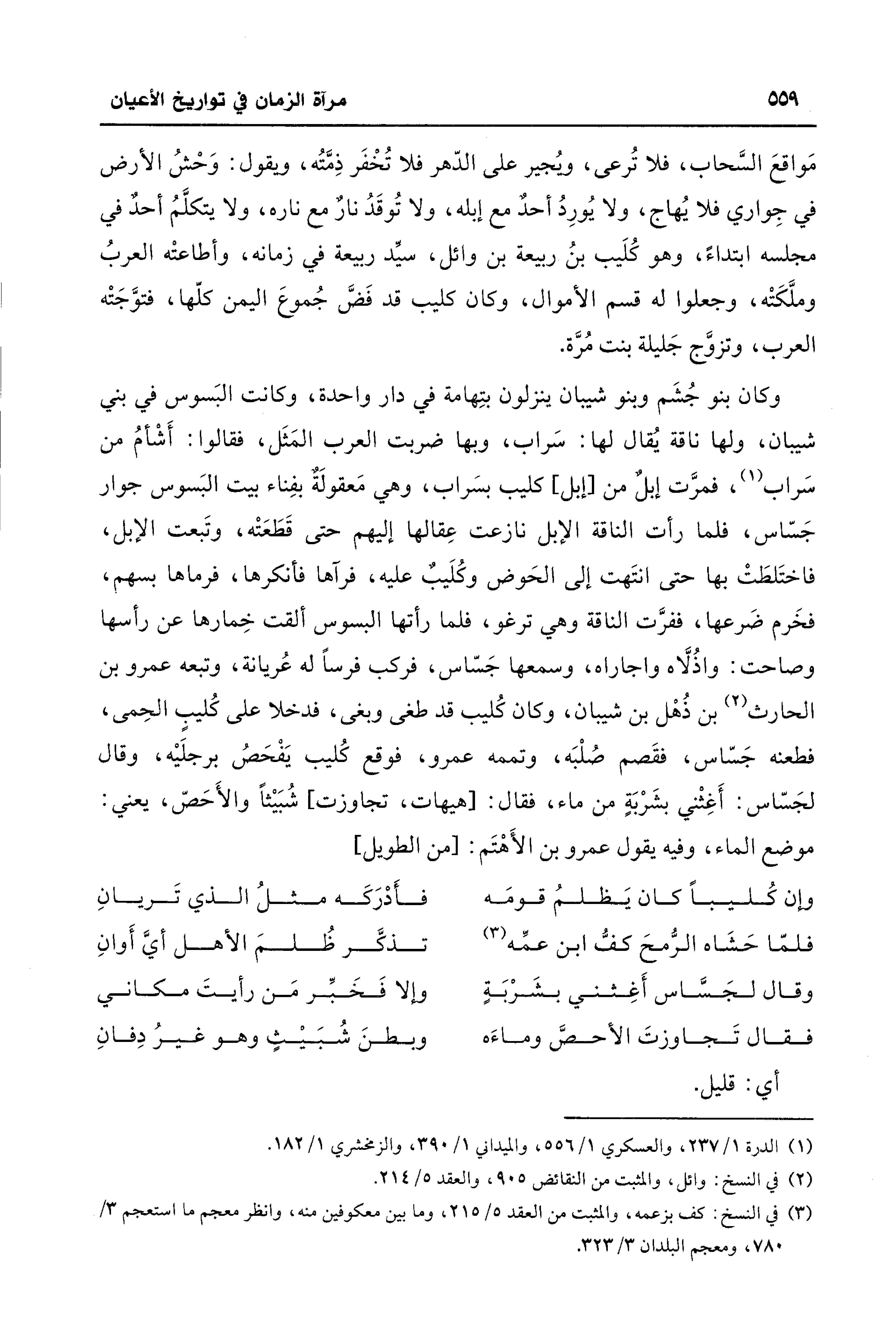 وكان بنو جُشَم وبنو شيبان ينزلون بتِهامة في دار واحدة، وكانت البَسوس في بني شيبان، ولها ناقة يُقال لها: سَراب، وبها ضربت العرب المَثَل، فقالوا: أَشْأمُ من سَراب (¬1)، فمرَّت إبلٌ من [إبل] كليب بسَراب، وهي مَعقولَة بفِناء بيت البَسوس جوار جَسّاس، فلما رأت الناقة الإبل نازعت عِقالها إليهم حتَّى قَطَعَتْه، وتَبعت الإبل، فاختَلطَتْ بها حتَّى انتَهت إلى الحَوض وكُلَيبٌ عليه، فرآها فأنكرها، فرماها بسهم، فخَرم ضَرعها، ففرَّت الناقة وهي ترغو، فلما رأتها البسوس ألقت خِمارها عن رأسها وصاحت: واذُلَّاه واجاراه، وسمعها جَسّاس، فركب فرسًا له عُريانة، وتبعه عمرو بن الحارث (¬2) بن ذُهْل بن شيبان، وكان كُليب قد طغى وبغى، فدخلا على كُليبٍ الحِمى، فطعنه جَسّاس، فقَصم صُلْبَه، وتممه عمرو، فوقع كُليب يَفْحَصُ برجلَيْه، وقال لجَسّاس: أَغِثْني بشَرْبَةٍ من ماء، فقال: [هيهات، تجاوزت] شُبَيْثاً والأَحَصّ، يعني: موضع الماء، وفيه يقول عمرو بن الأَهْتَم: [من الطَّويل]