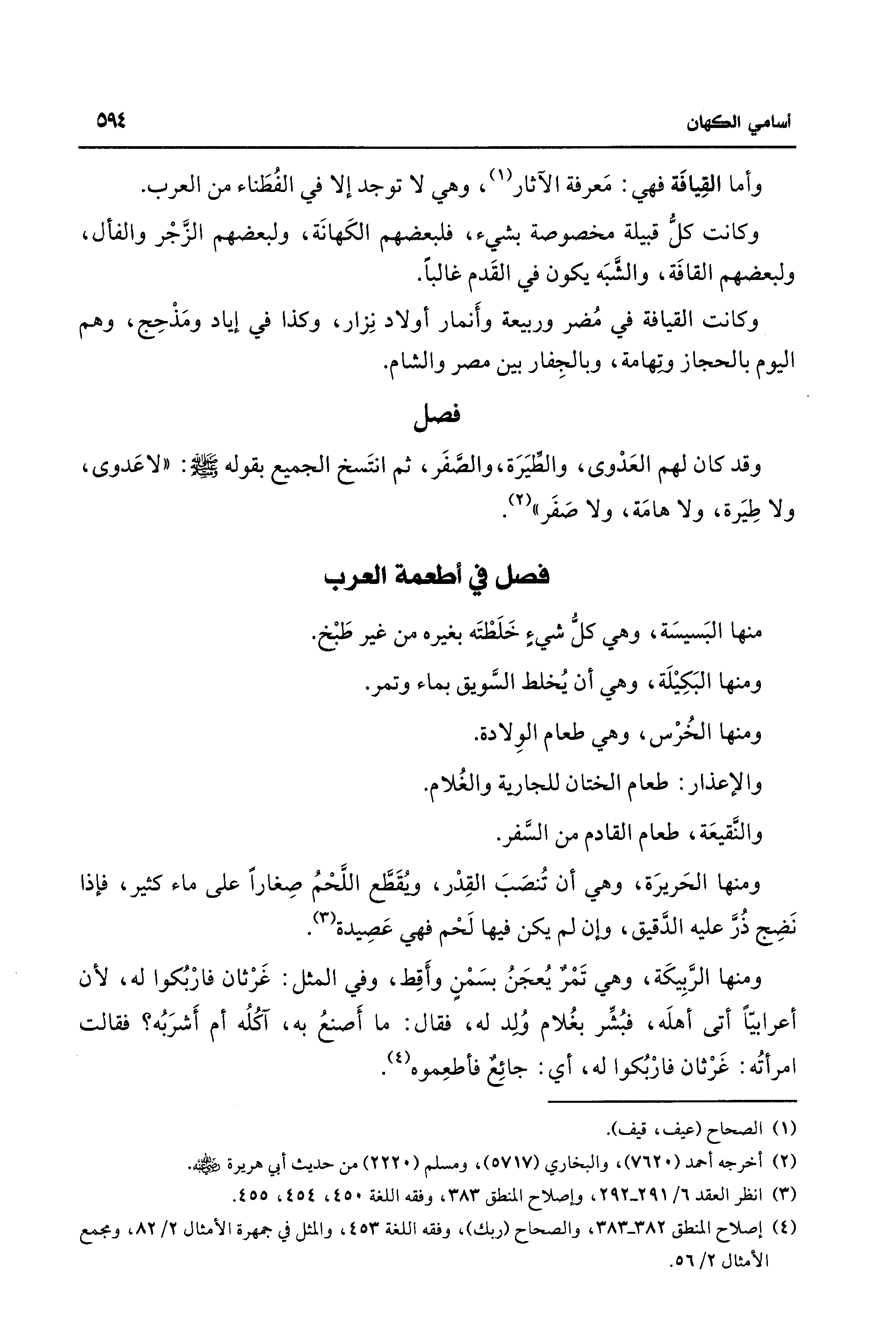 وكانت كلُّ قبيلة مخصوصة بشيء، فلبعضهم الكَهانَة، ولبعضهم الزَّجْر والفأل، ولبعضهم القافَة، والشَّبَه يكون في القَدم غالباً.