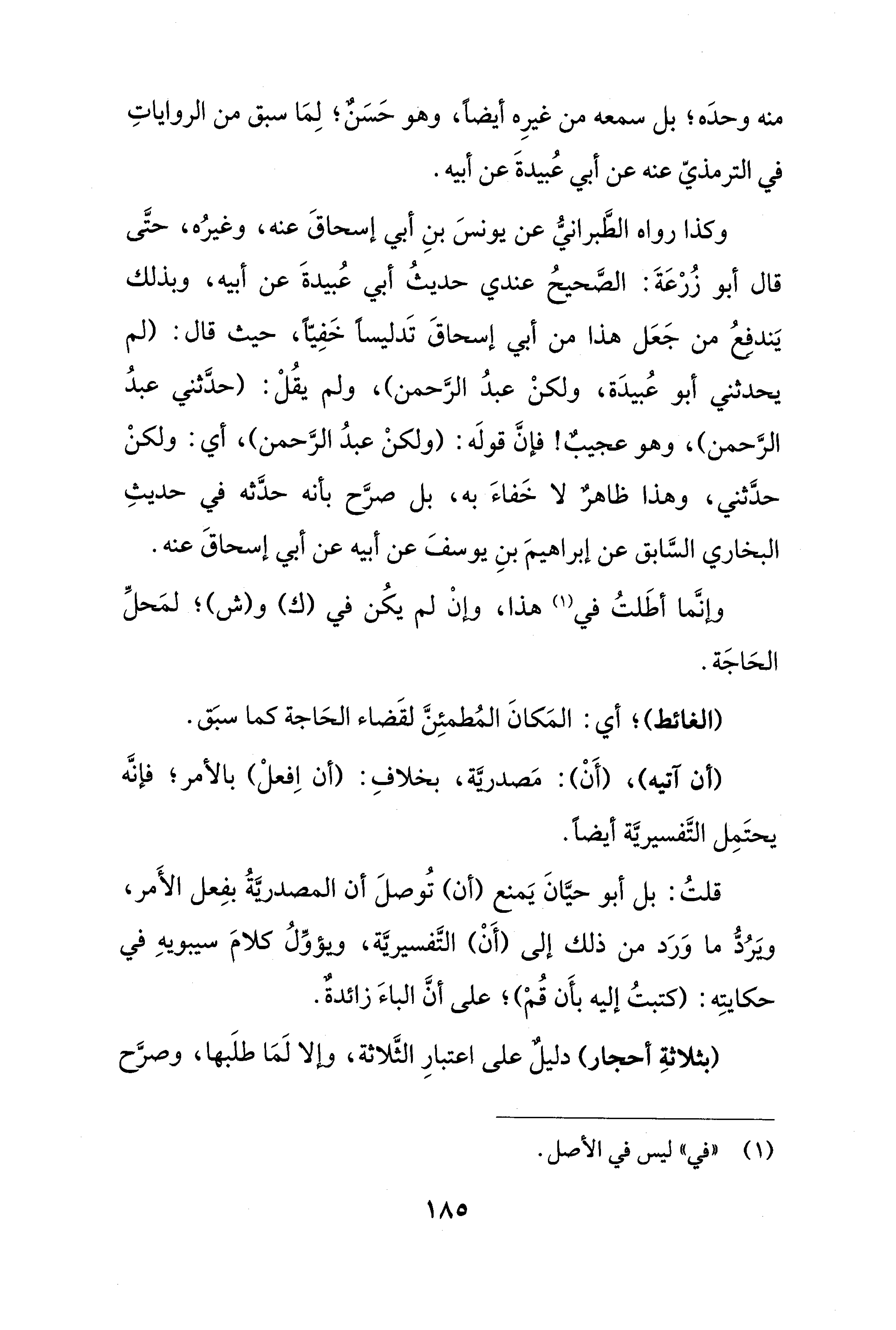 وكذا رواه الطَّبرانيُّ عن يونسَ بنِ أبي إسحاقَ عنه، وغيرُه، حتَّى قال أبو زُرْعَةَ: الصَّحيحُ عندي حديثُ أبي عُبيدةَ عن أبيه، وبذلك يَندفعُ من جَعَل هذا من أبي إسحاقَ تَدليسًا خَفِيًّا، حيث قال: (لم يحدثني أبو عُبيدَة، ولكنْ عبدُ الرَّحمن)، ولم يقُلْ: (حدَّثني عبدُ الرَّحمن)، وهو عجيبٌ! فإنَّ قولَه: (ولكنْ عبدُ الرَّحمن)، أي: ولكنْ حدَّثني، وهذا ظاهرٌ لا خَفاءَ به، بل صرَّح بأنه حدَّثه في حديثِ البخاري السَّابق عن إبراهيمَ بنِ يوسفَ عن أبيه عن أبي إسحاقَ عنه.