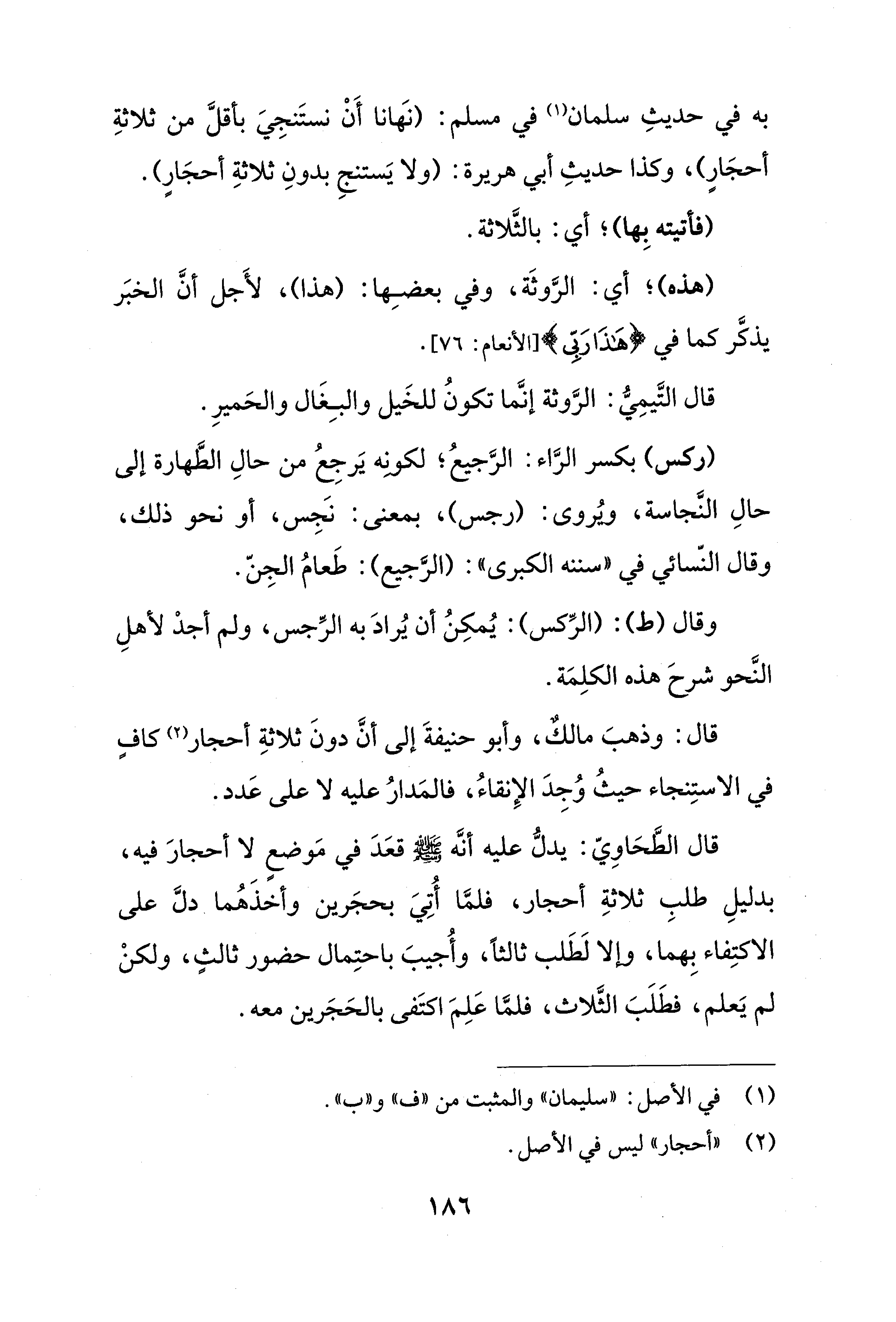 قال الطَّحَاوِيّ: يدلُّ عليه أنَّه - صلى الله عليه وسلم - قعَدَ في مَوضعٍ لا أحجارَ فيه، بدليلِ طلبِ ثلاثةِ أحجار، فلمَّا أُتِيَ بحجَرين وأخذَهُما دلَّ على الاكتِفاء بِهما، وإلا لَطَلب ثالثًا، وأُجيبَ باحتِمال حضور ثالثٍ، ولكنْ لم يَعلم، فطَلَبَ الثَّلاث، فلمَّا عَلِمَ اكتَفى بالحَجَرين معه.