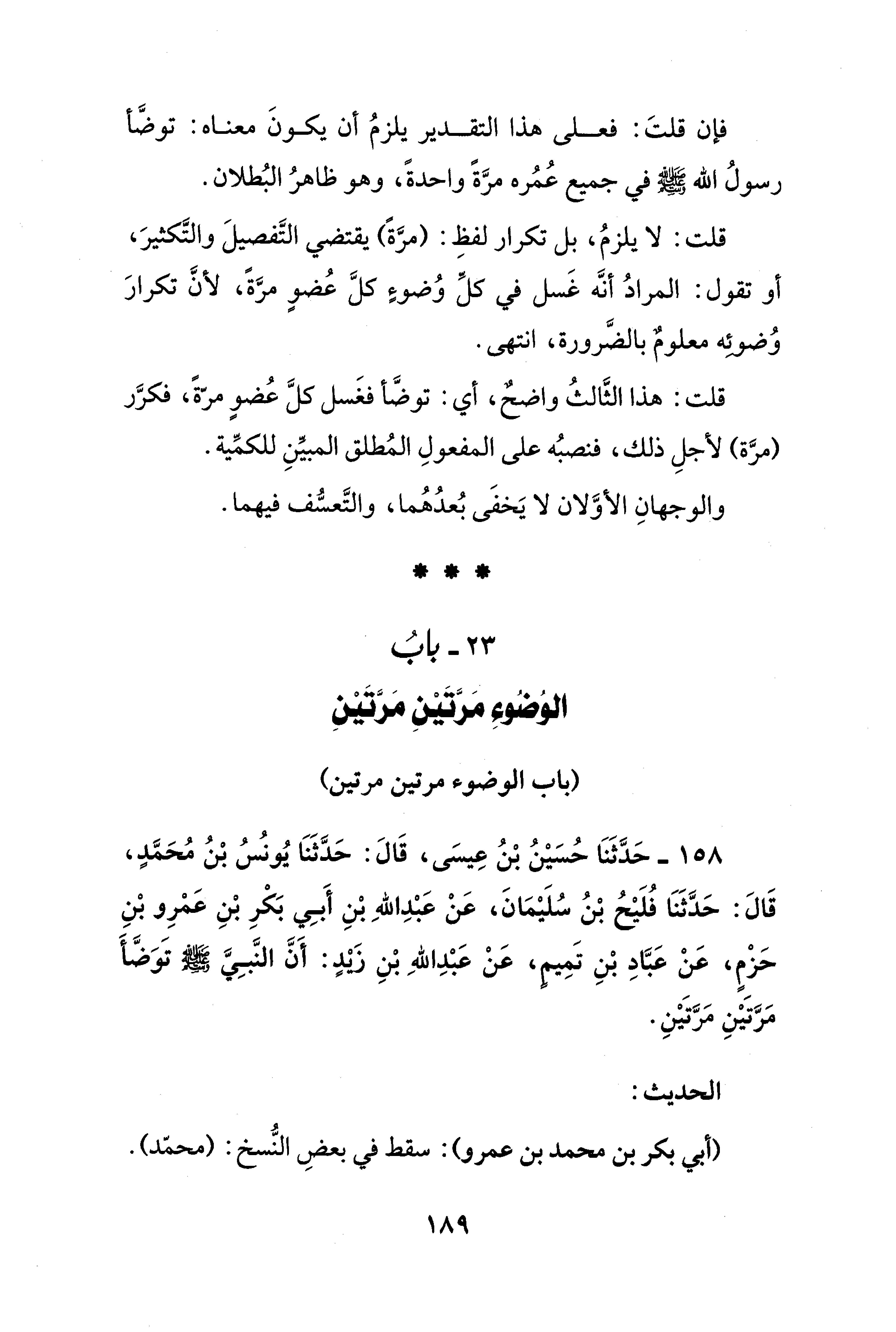 158 - حَدَّثَنَا حُسَيْنُ بْنُ عِيسَى، قَالَ: حَدَّثَنَا يُونسٌ بنُ مُحَمَّدٍ، قَالَ: حَدَّثَنَا فُلَيْحُ بْنُ سُلَيْمَانَ، عَنْ عَبْدِ اللهِ بْنِ أَبِي بَكْرِ بْنِ عَمرِو بْنِ حَزْمٍ، عَنْ عَبَّادِ بنِ تَمِيم، عَنْ عَبْدِ اللهِ بْنِ زيدٍ: أَنَّ النَّبِيَّ - صلى الله عليه وسلم - تَوَضَّأَ مَرَّتَيْنِ مَرَّتَيْنِ.