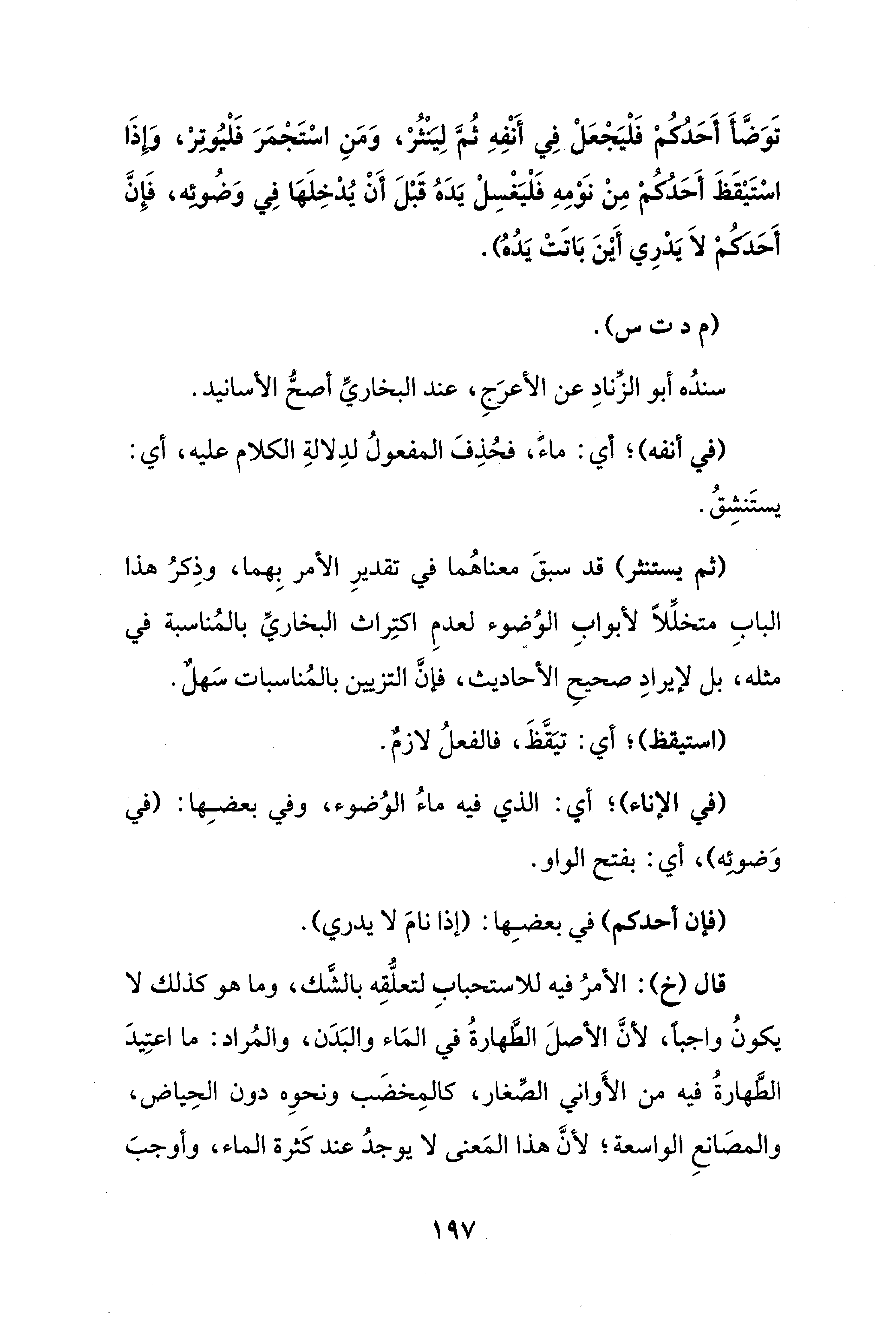 قال (خ): الأمرُ فيه للاستحبابِ لتعلُّقِه بالشَّك، وما هو كذلك لا يكونُ واجبًا، لأنَّ الأصلَ الطَّهارةُ في المَاء والبَدَن، والمُراد: ما اعتِيدَ الطَّهارةُ فيه من الأَواني الصَّغار، كالمِخضَب ونحوِه دون الحِياض، والمصَانعِ الواسعة؛ لأنَّ هذا المَعنى لا يوجدُ عند كَثرة الماء، وأوجبَ