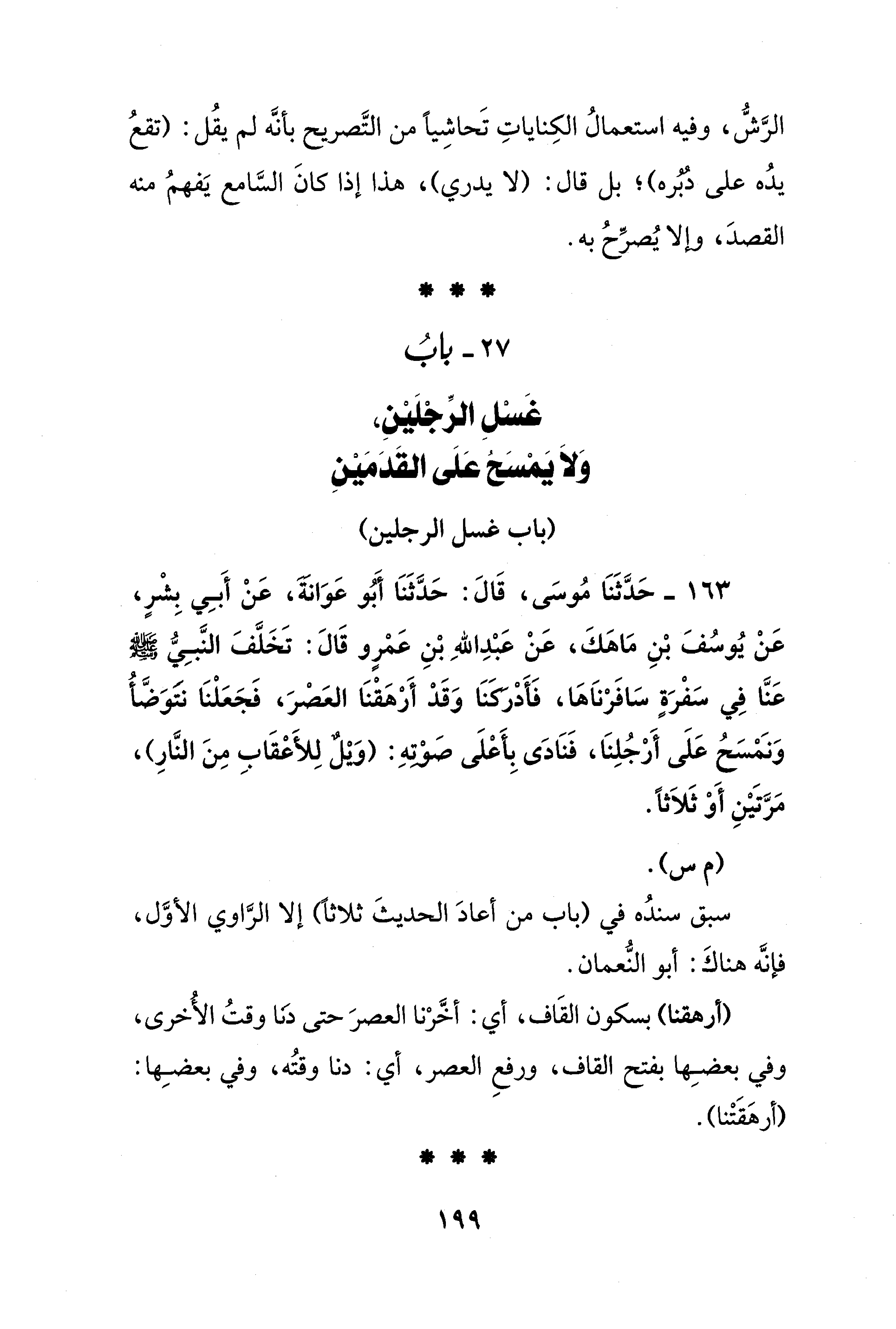 163 - حَدَّثَنَا مُوسَى، قَالَ: حَدَّثَنَا أَبُو عَوَانة، عَنْ أَبِي بِشْرٍ، عَنْ يُوسُفَ بْنِ مَاهكَ، عَنْ عَبْدِ اللهِ بْنِ عَمرٍو قَالَ: تَخَلَّفَ النَّبِيُّ - صلى الله عليه وسلم - عَنَّا فِي سَفْرَةٍ سَافَرْناَها، فَأَدركَنَا وَقَد أَرْهقْنَا العَصْرَ، فَجَعَلْنَا نتَوَضَّأُ وَنَمْسَحُ عَلَى أَرْجُلِنَا، فَنَادَى بِأَعْلَى صَوْتهِ: (ويلٌ لِلأَعْقَابِ مِنَ النَّارِ)، مَرَّتَيْنِ أَوْ ثَلاَثًا.