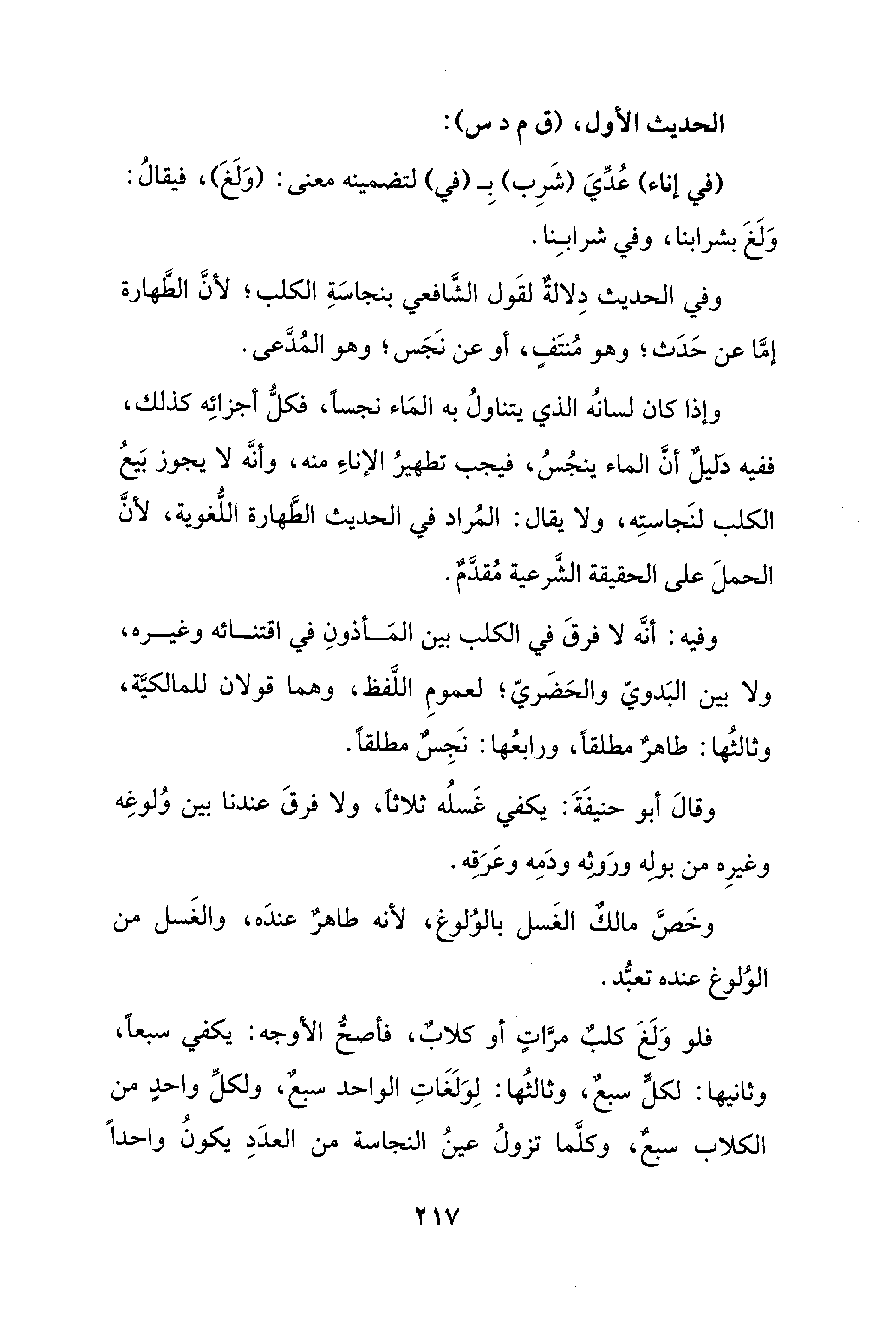 وفيه: أنَّه لا فرقَ في الكلب بين المَأذونِ في اقتنائه وغيره، ولا بين البَدويّ والحَضَريّ؛ لعمومِ اللَّفظ، وهما قولان للمالكيَّة، وثالثُها: طاهرٌ مطلقًا، ورابعُها: نَجِسٌ مطلقًا.