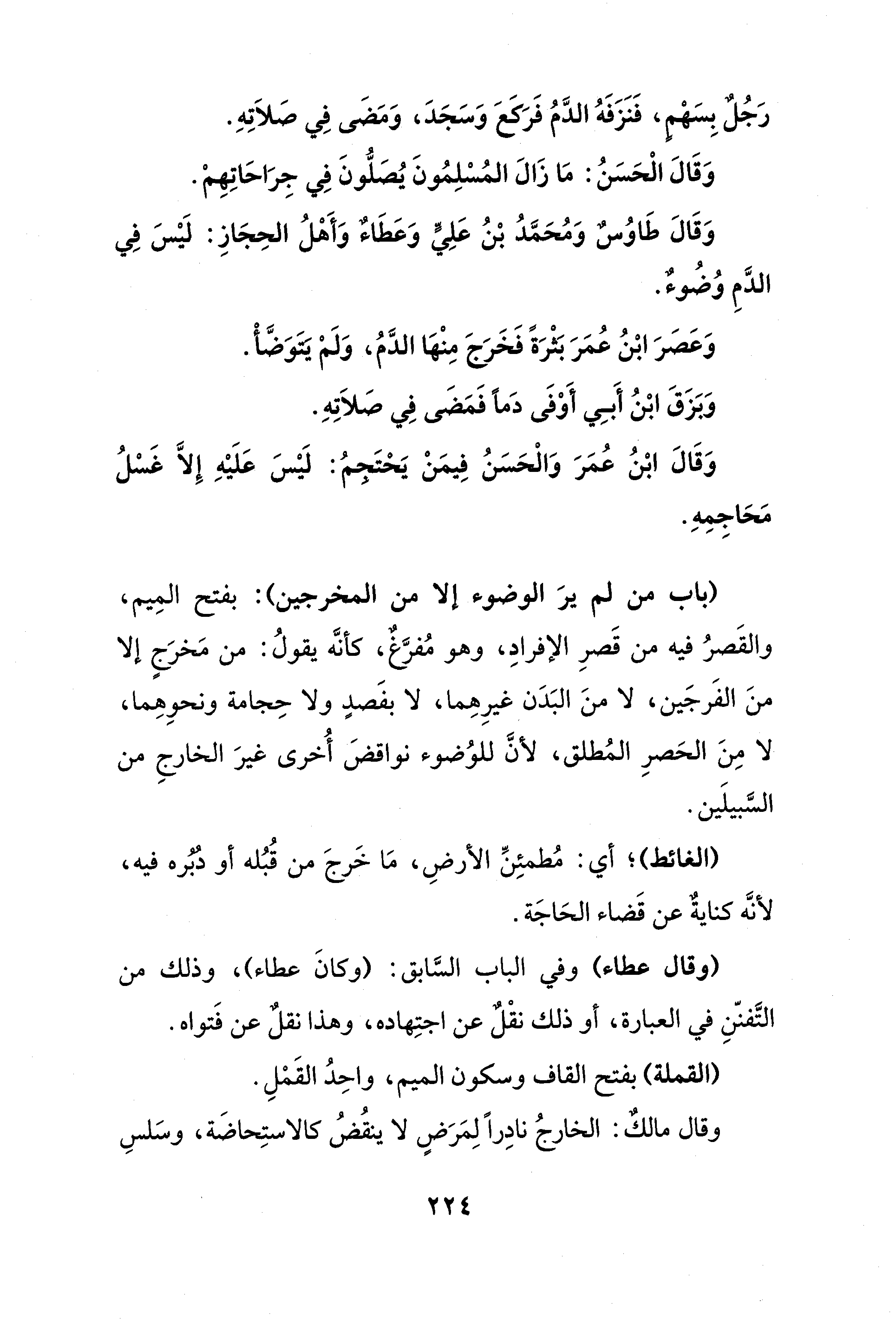 (باب من لم يرَ الوضوء إلا من المخرجين): بفتح المِيم، والقَصرُ فيه من قَصرِ الإفرادِ، وهو مُفرَّغٌ، كأنَّه يقولُ: من مَخرَجٍ إلا منَ الفَرجَين، لا منَ البَدَن غيرِهِما، لا بفَصدٍ ولا حِجامة ونحوِهِما، لا مِنَ الحَصرِ المُطلق، لأنَّ للوُضوء نواقضَ أُخرى غيرَ الخارجِ من السَّبيلَين.