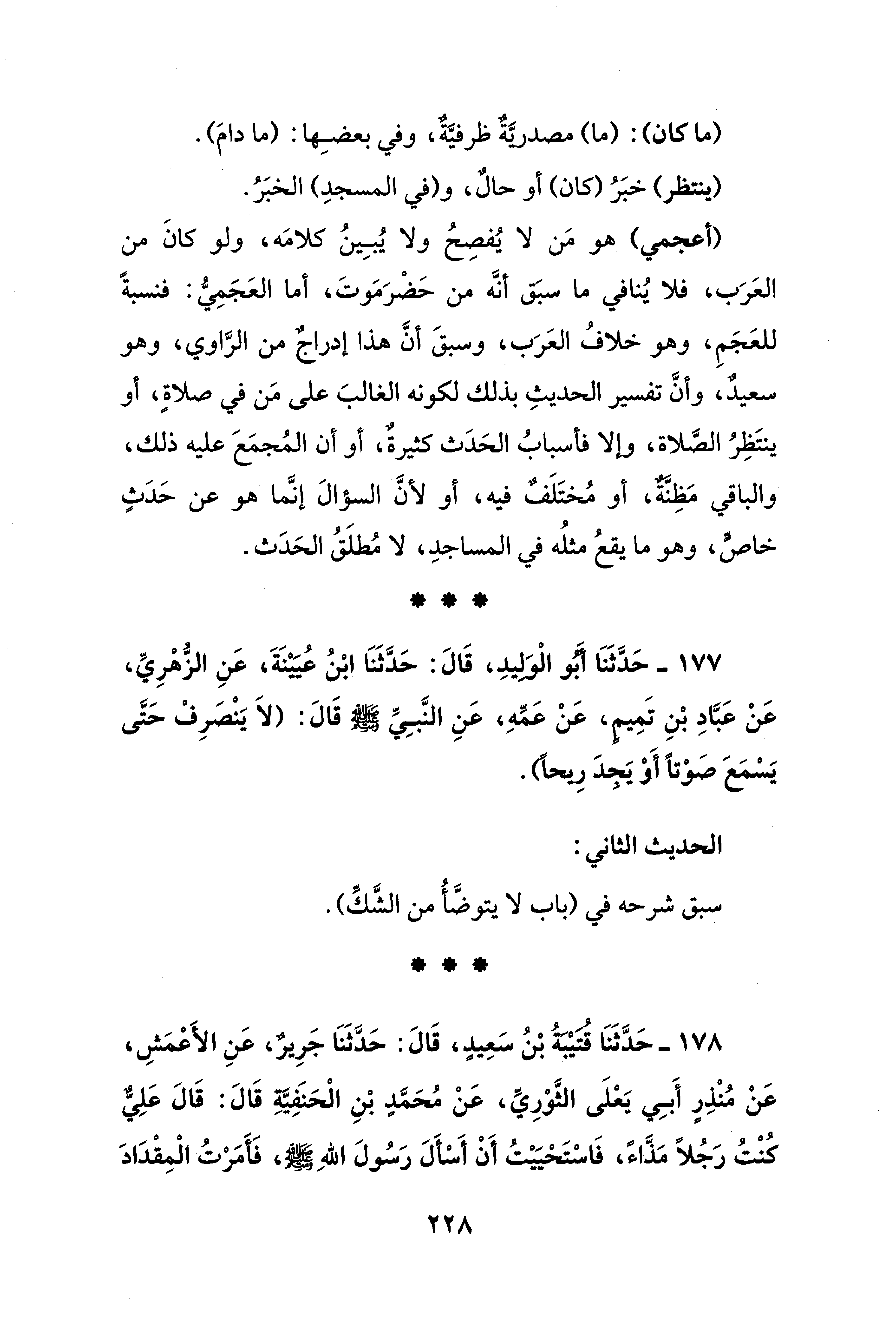 177 - حَدَّثَنَا أَبو الْوَليدِ، قَالَ: حَدَّثَنَا ابْنُ عُيَيْنَةَ، عَنِ الزُّهْرِيِّ، عَنْ عَبَّادِ بْنِ تَمِيم، عَنْ عَمِّهِ، عَنِ النَّبِيِّ - صلى الله عليه وسلم - قَالَ: (لاَ يَنْصَرِفْ حَتَّى يَسْمَعَ صَوْتًا أَوْ يَجدَ رِيحًا).