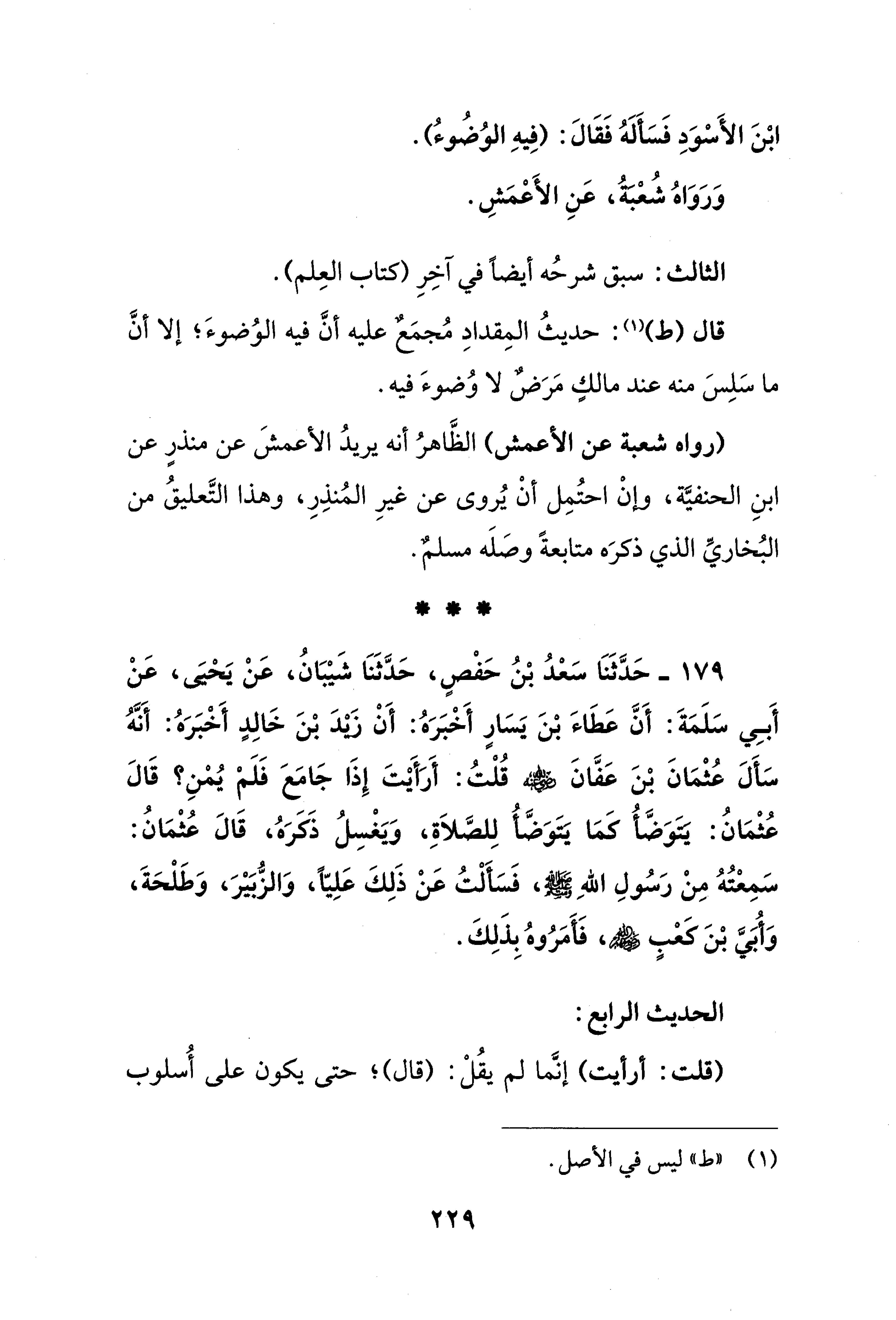 179 - حَدَّثَنَا سَعْدُ بْنُ حَفْصٍ، حَدَّثَنَا شَيْبَانُ، عَنْ يَحيَى، عَنْ أَبِي سَلَمَةَ: أَنَّ عَطَاءَ بْنَ يَسَارٍ أَخْبَرَهُ: أَنْ زيدَ بْنَ خَالِدٍ أَخْبَرَهُ: أنَّهُ سَأَلَ عُثْمَانَ بْنَ عَفَّانَ - رضي الله عنه - قُلْتُ: أَرَأَيْتَ إِذَا جَامَعَ فَلَمْ يُمنِ؟ قَالَ عُثْمَانُ: يتَوَضَّأُ كَمَا يتَوَضَّأُ لِلصَّلاَةِ، وَيَغْسِلُ ذَكَرَهُ، قَالَ عُثْمَانُ: سَمِعتُهُ مِنْ رَسُولِ اللهِ - صلى الله عليه وسلم -، فَسَأَلْتُ عَنْ ذَلِكَ عَلِيًّا، وَالزُّبَيْرَ، وَطَلْحَةَ، وَأُبَيَّ بْنَ كَعبٍ - رضي الله عنهم -، فَأمَرُوهُ بِذَلِكَ.
