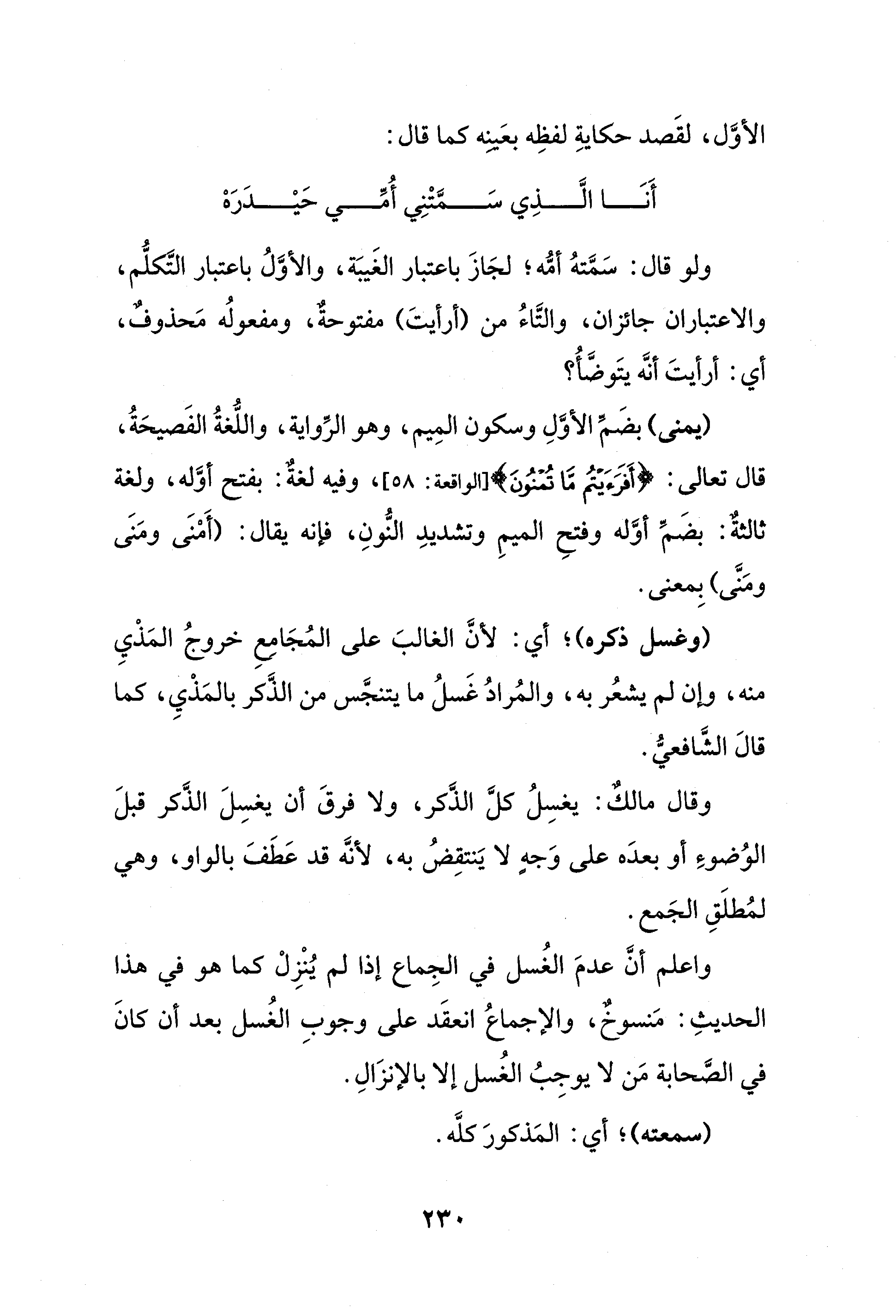 (يمنى) بضَمِّ الأوَّلِ وسكون المِيم، وهو الرِّواية، واللُغةُ الفَصيحَةُ، قال تعالى: {أَفَرَأَيْتُمْ مَا تُمْنُونَ} [الواقعة: 58]، وفيه لغة: بفتح أوَّله، ولغة ثالثة: بضَمّ أوَّله وفتحِ الميمِ وتشديدِ النُّونِ، فإنه يقال: (أَمنَى ومَنَى ومَنَّى) بِمعنى.