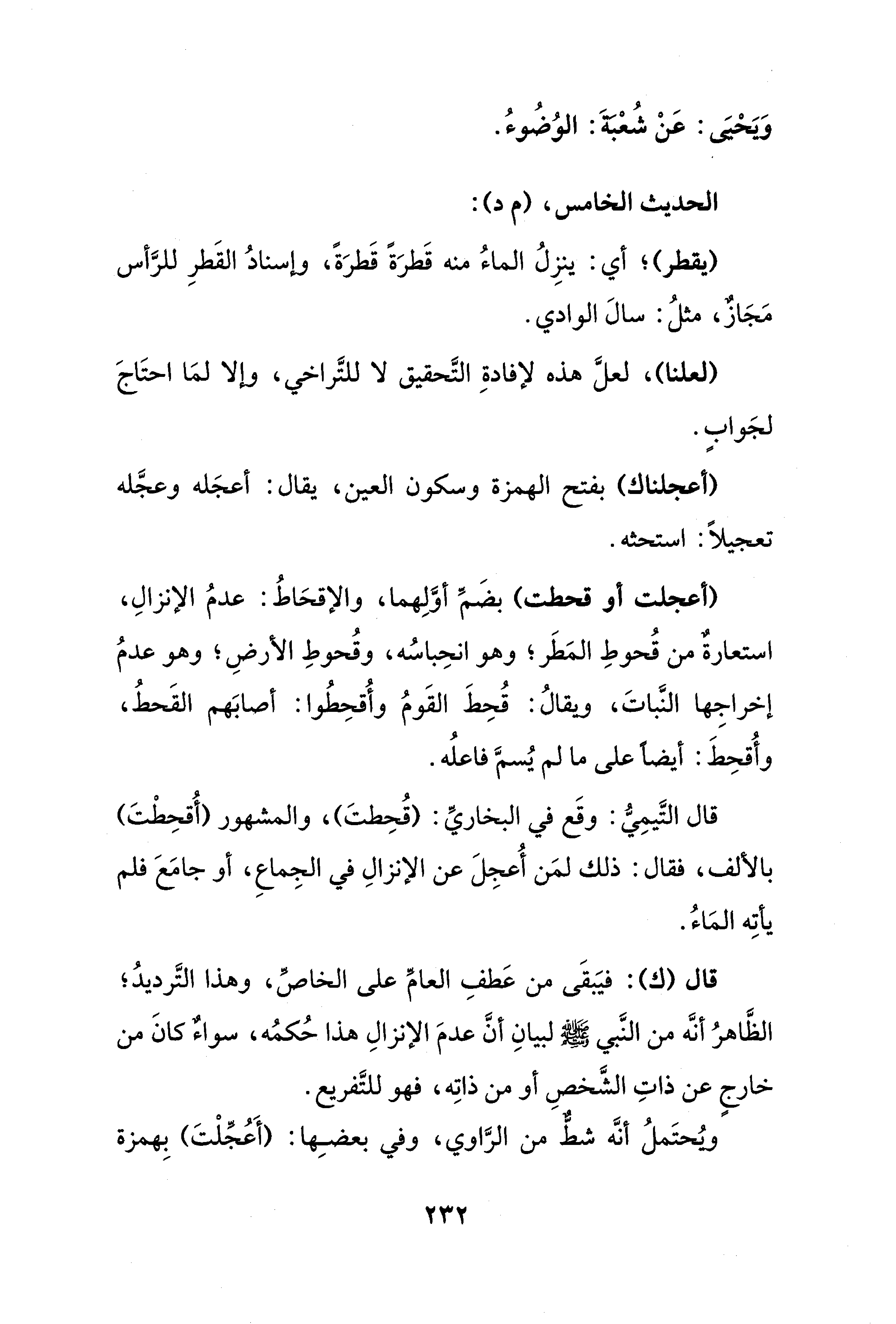 قال التَّيمِيُّ: وقَع في البخاريّ: (قُحِطتَ)، والمشهور (أُقحِطْتَ) بالألف، فقال: ذلك لمَن أُعجِلَ عن الإنزالِ في الجِماعِ، أو جامَعَ فلم يأتِه المَاءُ.