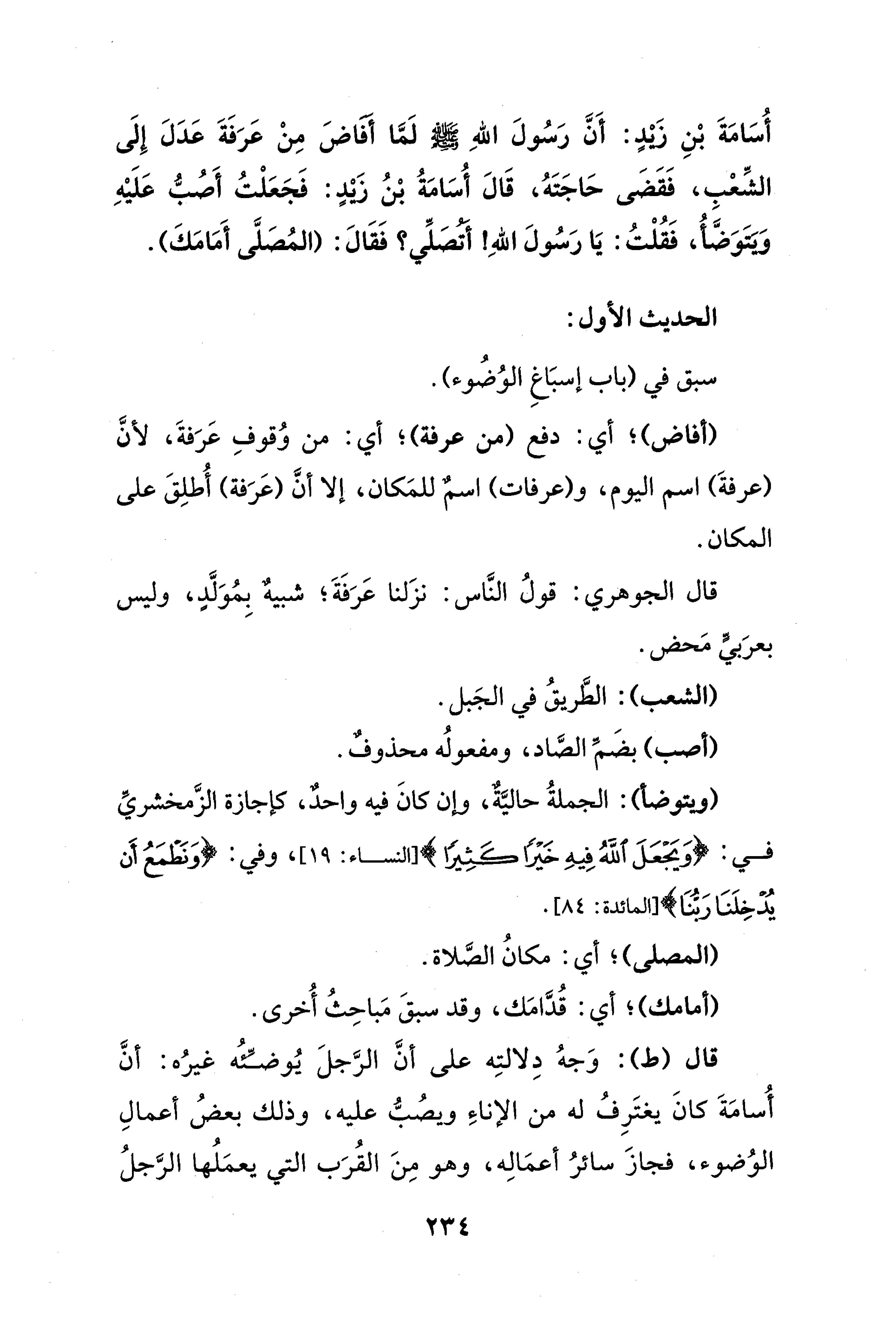 أُسَامَةَ بْنِ زيدٍ: أَنَّ رَسُولَ اللهِ - صلى الله عليه وسلم - لَمَّا أفاضَ مِنْ عَرَفَةَ عَدَلَ إِلَى الشِّعْبِ، فَقَضَى حَاجَتَهُ، قَالَ أُسَامَةُ بْنُ زيدٍ: فَجَعَلْتُ أَصُبُّ عَلَيْهِ وَيتَوَضَّأُ، فَقُلْتُ: يَا رَسُولَ اللهِ! أتصَلِّي؟؟ فَقَالَ: (المُصَلَّى أَمَامَكَ).