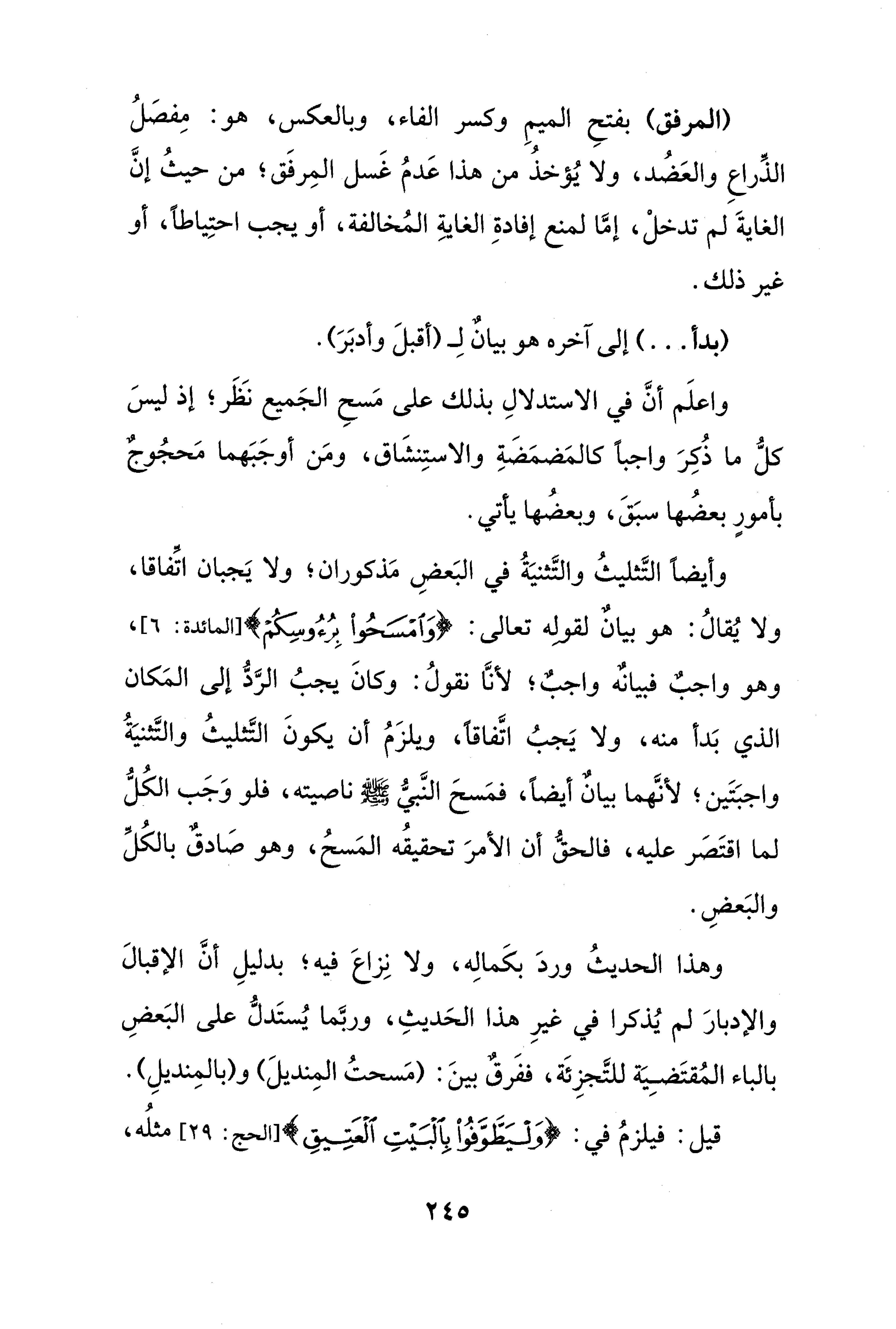 (المرفق) بفتحِ الميمِ وكسر الفاء، وبالعكس، هو: مِفصَلُ الذِّراعِ والعَضُد، ولا يُؤخذُ من هذا عَدمُ غَسل المِرفَق؛ من حيثُ إنَّ الغايةَ لم تدخلْ، إمَّا لمنع إفادةِ الغايةِ المُخالفة، أو يجب احتِياطًا، أو غير ذلك.