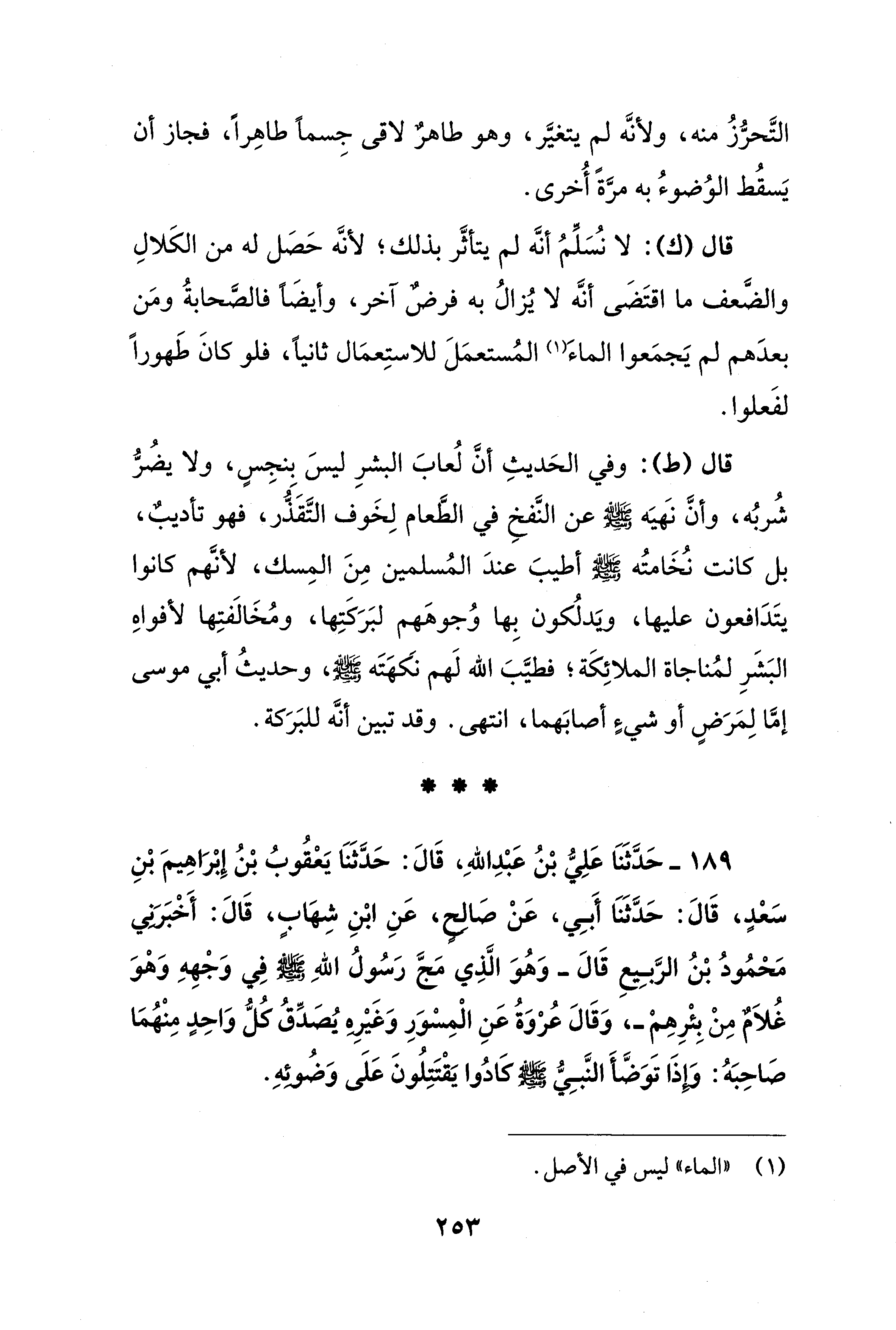 189 - حَدَّثَنَا عَلِيُّ بْنُ عَبْدِ اللهِ، قَالَ: حَدَّثَنَا يَعْقُوبُ بْنُ إِبْراهِيمَ بْنِ سَعْدٍ، قَالَ: حَدَّثَنَا أَبِي، عَنْ صَالحٍ، عَنِ ابْنِ شِهابٍ، قَالَ: أَخْبَرَني مَحمُودُ بْنُ الرَّبِيعِ قَالَ -وَهُوَ الَّذِي مَجَّ رَسُولُ اللهِ - صلى الله عليه وسلم - فِي وَجْهِهِ وَهْوَ غُلاَمٌ مِنْ بِئْرِهم-، وَقَالَ عُروَةُ عَنِ الْمِسْوَرِ وَغَيْرِه يُصَدِّقُ كُلُّ وَاحِدٍ مِنْهُمَا صَاحِبَهُ: وَوإذَا تَوَضَّأَ النَّبِيُّ - صلى الله عليه وسلم - كَادُوا يَقْتَتِلُونَ عَلَى وَضُوئهِ.