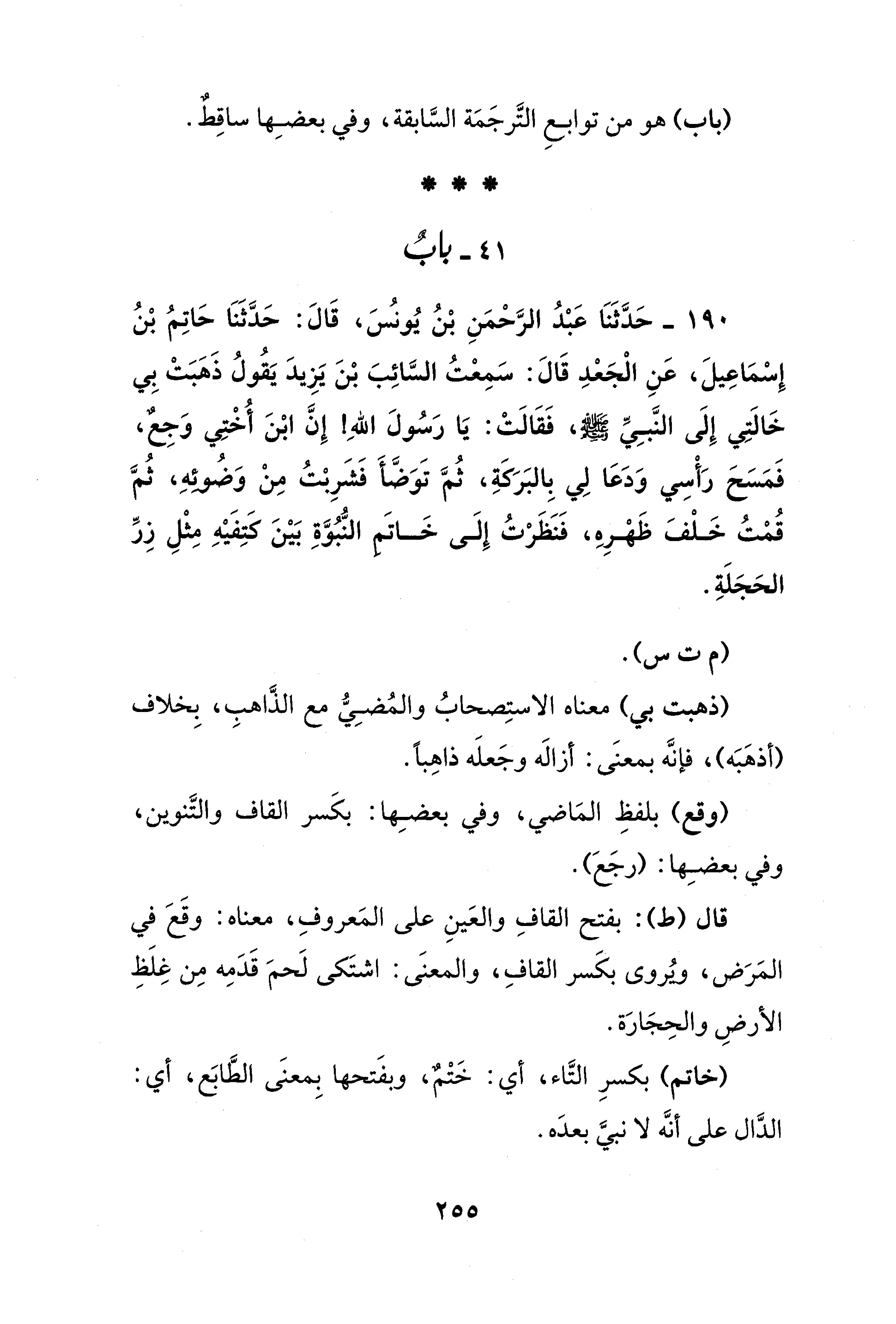 190 - حَدَّثَنَا عَبْدُ الرَّحمَنِ بْنُ يُونسُ، قَالَ: حَدَّثَنا حَاتِمُ بْنُ إِسْمَاعِيلَ، عَنِ الْجَعدِ قَالَ: سَمِعتُ السَّائِبَ بْنَ يَزِيدَ يَقُولُ ذَهبَتْ بِي خَالَتِي إِلَى النَّبِيِّ - صلى الله عليه وسلم -، فَقَالَتْ: يَا رَسُولَ اللهِ! إِنَّ ابْنَ أُخْتِي وَجِعٌ، فَمَسَحَ رَأْسِي وَدَعَا لِي بِالبَرَكَةِ، ثُمَّ تَوَضَّأَ فَشَرِبْتُ مِنْ وَضُوئهِ، ثمَّ قُمْتُ خَلْفَ ظَهْرِهِ، فَنَظَرتُ إِلَى خَاتَم النُّبُوَّةِ بَيْنَ كتِفَيْهِ مِثْلِ زِرِّ الحَجَلَةِ.