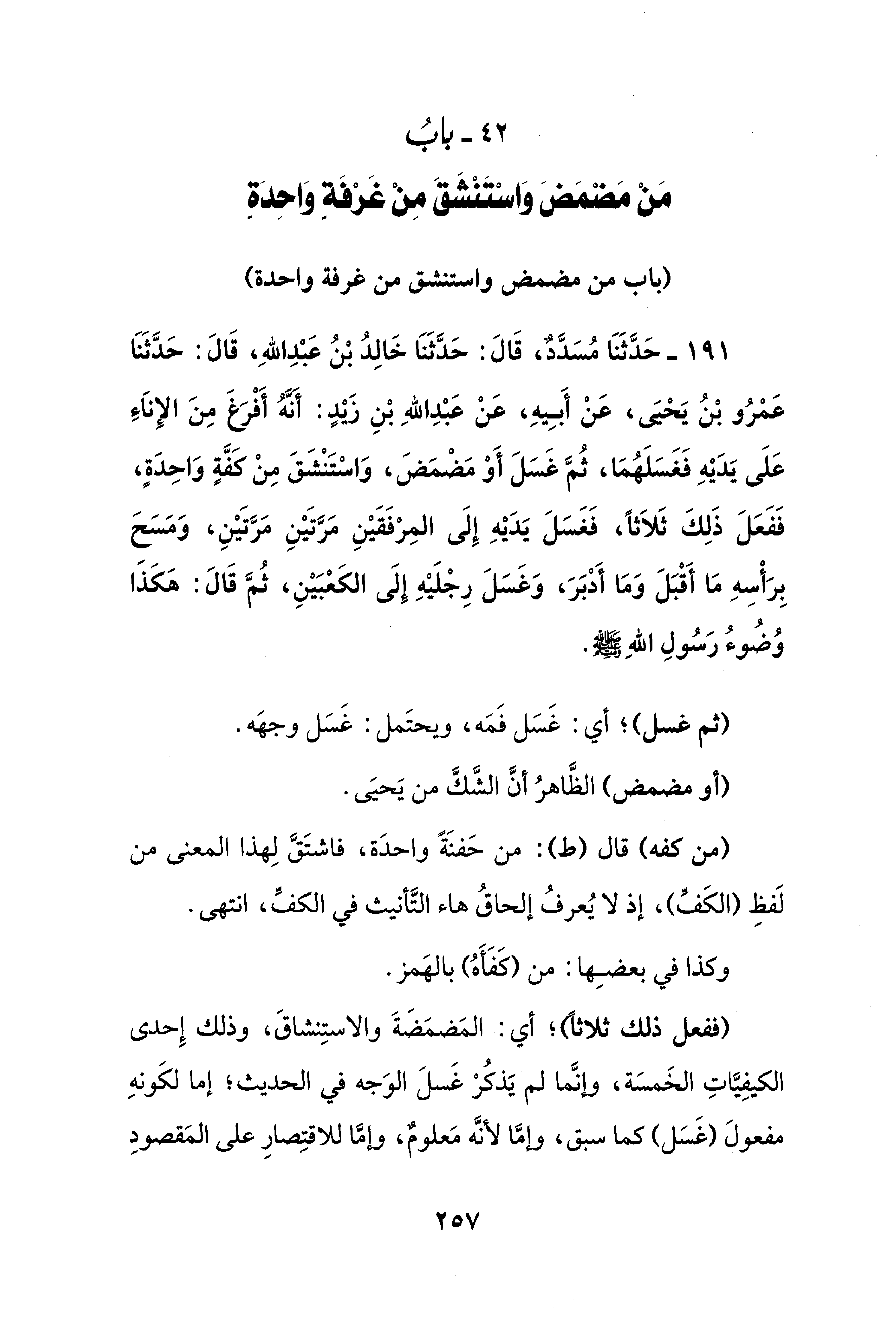42 - بابُ مَنْ مَضْمَضَ وَاستنْشَقَ مِنْ غَرْفَةٍ واحِدَةٍ