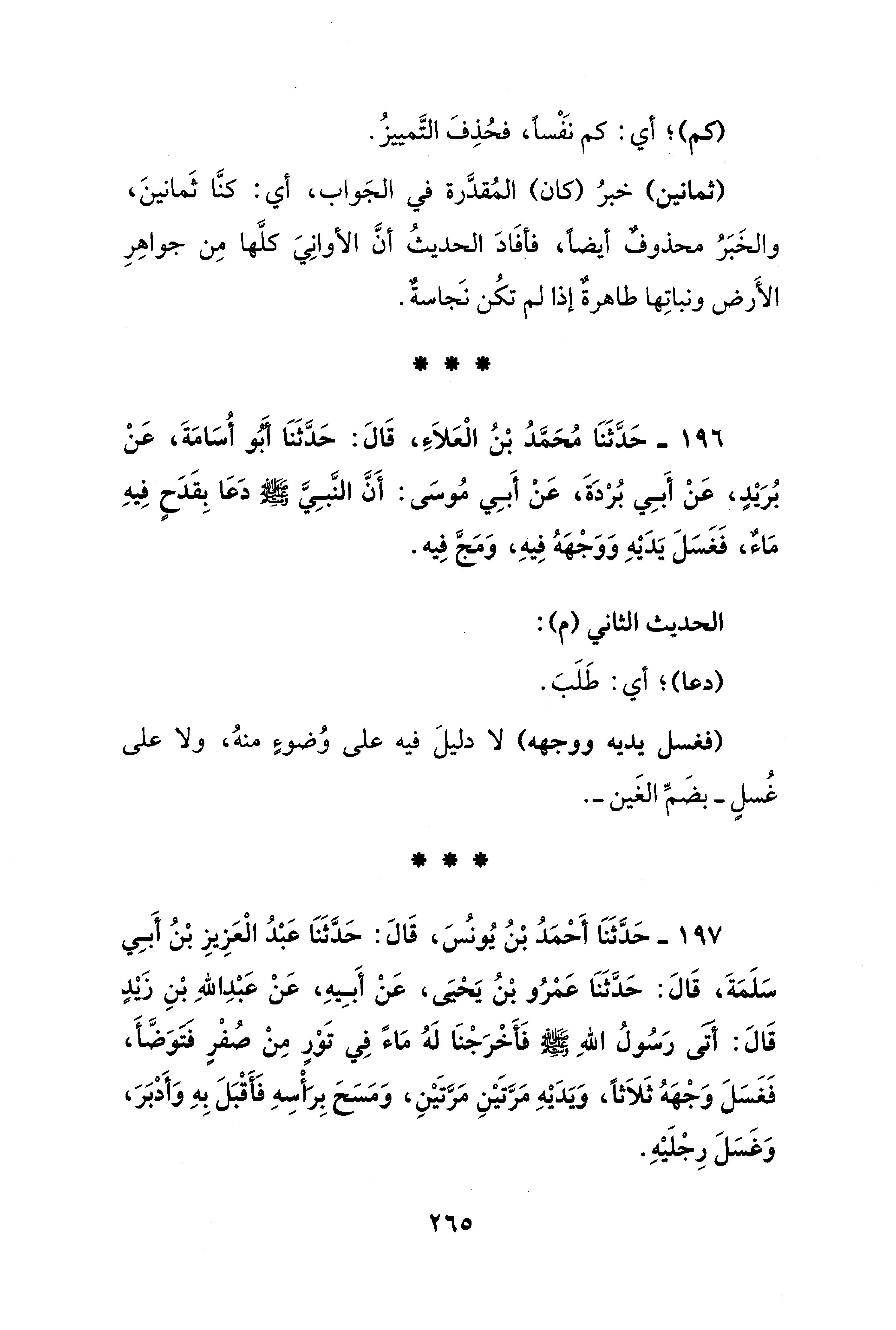 196 - حَدَّثَنَا مُحَمَّدُ بْنُ الْعَلاَءَ، قَالَ: حَدَّثَنَا أَبُو أُسَامَةَ، عَنْ بُرَيْدٍ، عَنْ أَبِي برْدَةَ، عَنْ أَبِي مُوسَى: أَنَّ النَّبِي - صلى الله عليه وسلم - دَعَا بِقَدحٍ فِيهِ مَاءٌ، فَغَسَلَ يَدَيْهِ وَوَجْههُ فِيهِ، وَمَجَّ فِيه.