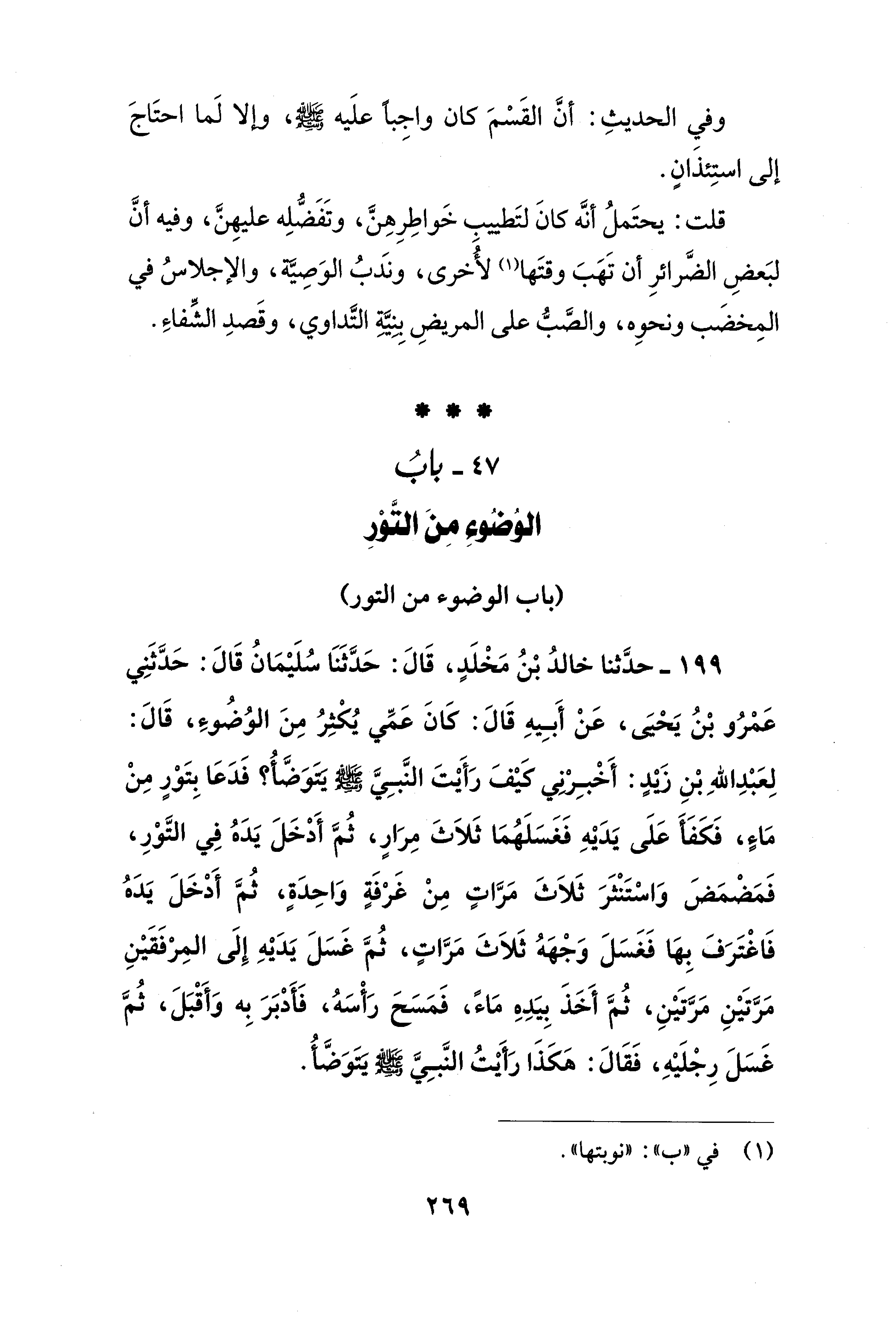 199 - حدَّثنا خالدُ بْنُ مَخْلَدٍ، قَالَ: حَدَّثَنَا سُلَيْمَانُ قَالَ: حَدَّثَنِي عَمرُو بْنُ يحيَى، عَنْ أَبِيهِ قَالَ: كَانَ عَمِّي يُكْثِرُ مِنَ الوُضُوءِ، قَالَ: لِعَبْدِ اللهِ بنِ زَيدٍ: أَخْبِرني كَيْفَ رَأَيتَ النَّبِي - صلى الله عليه وسلم - يتَوَضَّأُ؟ فَدَعَا بِتَوْرٍ مِنْ مَاء، فَكَفَأَ عَلَى يَدَيْهِ فَغَسَلَهُمَا ثَلاَثَ مِرَارٍ، ثُمَّ أَدخَلَ يَدَهُ فِي التَّوْرِ، فَمَضْمَضَ وَاسْتَنْثَرَ ثَلاَثَ مَرَّاتٍ مِنْ غَرْفَةٍ وَاحِدَةٍ، ثُمَّ أَدخَلَ يَدَهُ فَاغْتَرَفَ بِها فَغَسَلَ وَجْههُ ثَلاَثَ مَرَّاتٍ، ثُمَّ غَسَلَ يَدَيْهِ إِلَى المِرْفَقَيْنِ مَرَّتَيْنِ مَرَّتَيْنِ، ثُمَّ أَخَذَ بِيَدِهِ مَاءً، فَمَسَحَ رَأْسَهُ، فَأدبَرَ بِه وَأَقْبَلَ، ثُمَّ غَسَلَ رِجْلَيْهِ، فَقَالَ: هكَذَا رَأَيْتُ النَّبِيَّ - صلى الله عليه وسلم - يتَوَضَّأُ.