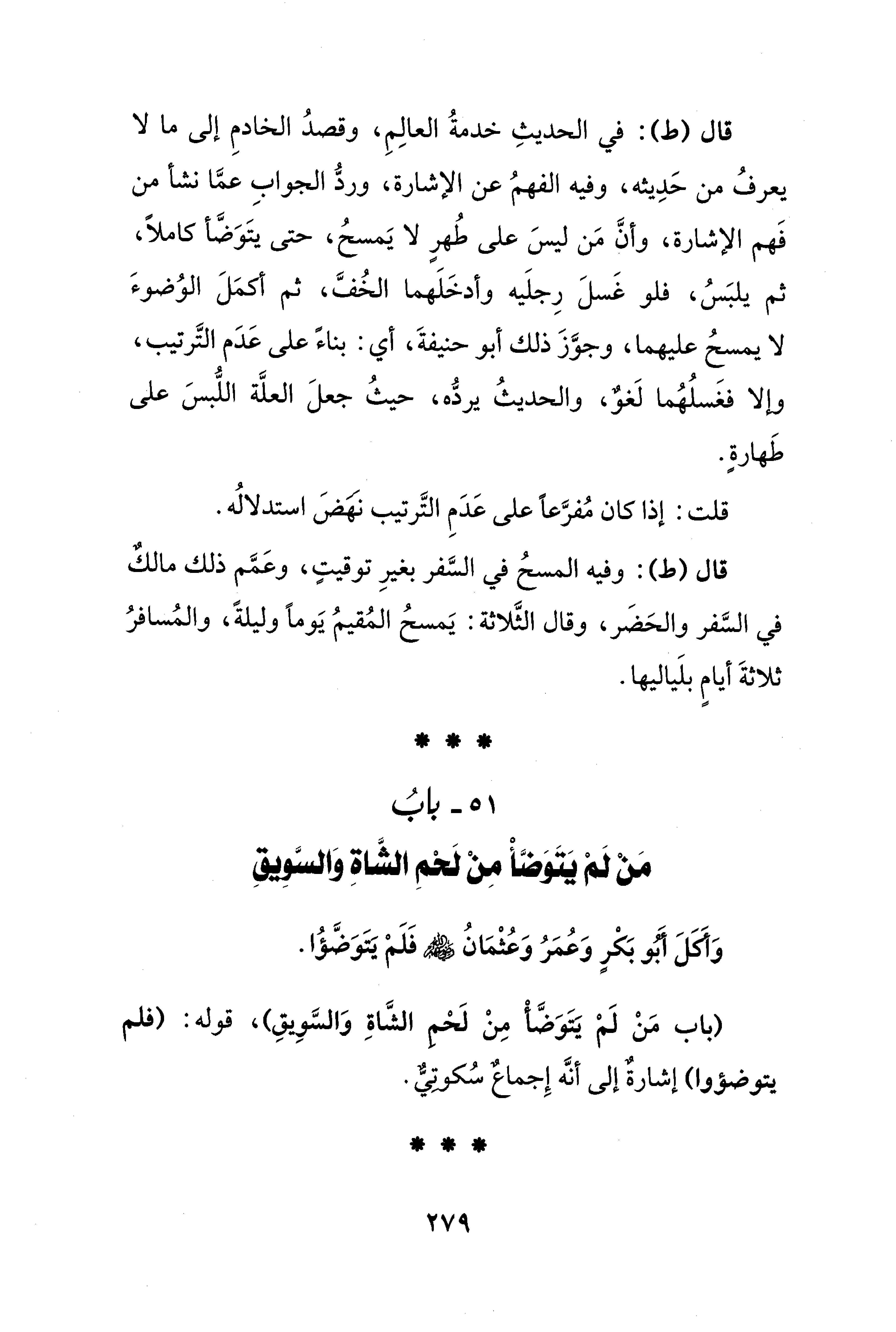 قال (ط): وفيه المسحُ في السَّفر بغيرِ توقيتٍ، وعَمَّم ذلك مالكٌ في السَّفر والحَضَر، وقال الثَّلاثة: يَمسحُ المُقيمُ يَومًا وليلةً، والمُسافرُ ثلاثةَ أيامٍ بلَياليها.