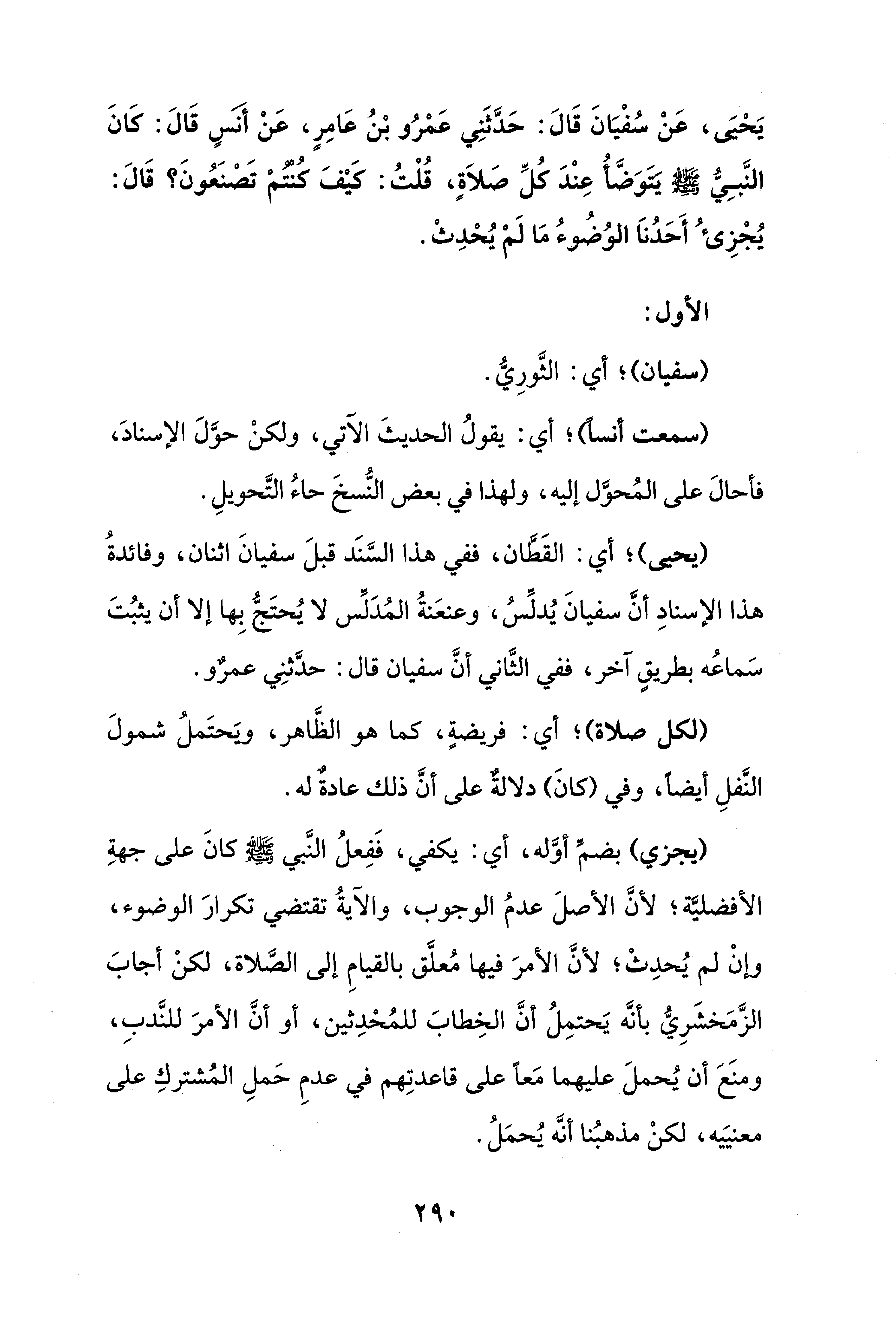 يَحيَى، عَنْ سُفْيَانَ قَالَ: حَدَّثَنِي عمرُو بْنُ عَامِر، عَنْ أَنسٍ قَالَ: كانَ النَّبِيُّ - صلى الله عليه وسلم - يتَوَضَّأُ عِنْدَ كُلِّ صَلاَةٍ، قُلْتُ: كيْفَ كنتم تَصنَعُونَ؟ قَالَ: يُجْزِئُ أَحَدُناَ الوُضُوءُ مَا لَم يُحدِثْ.
