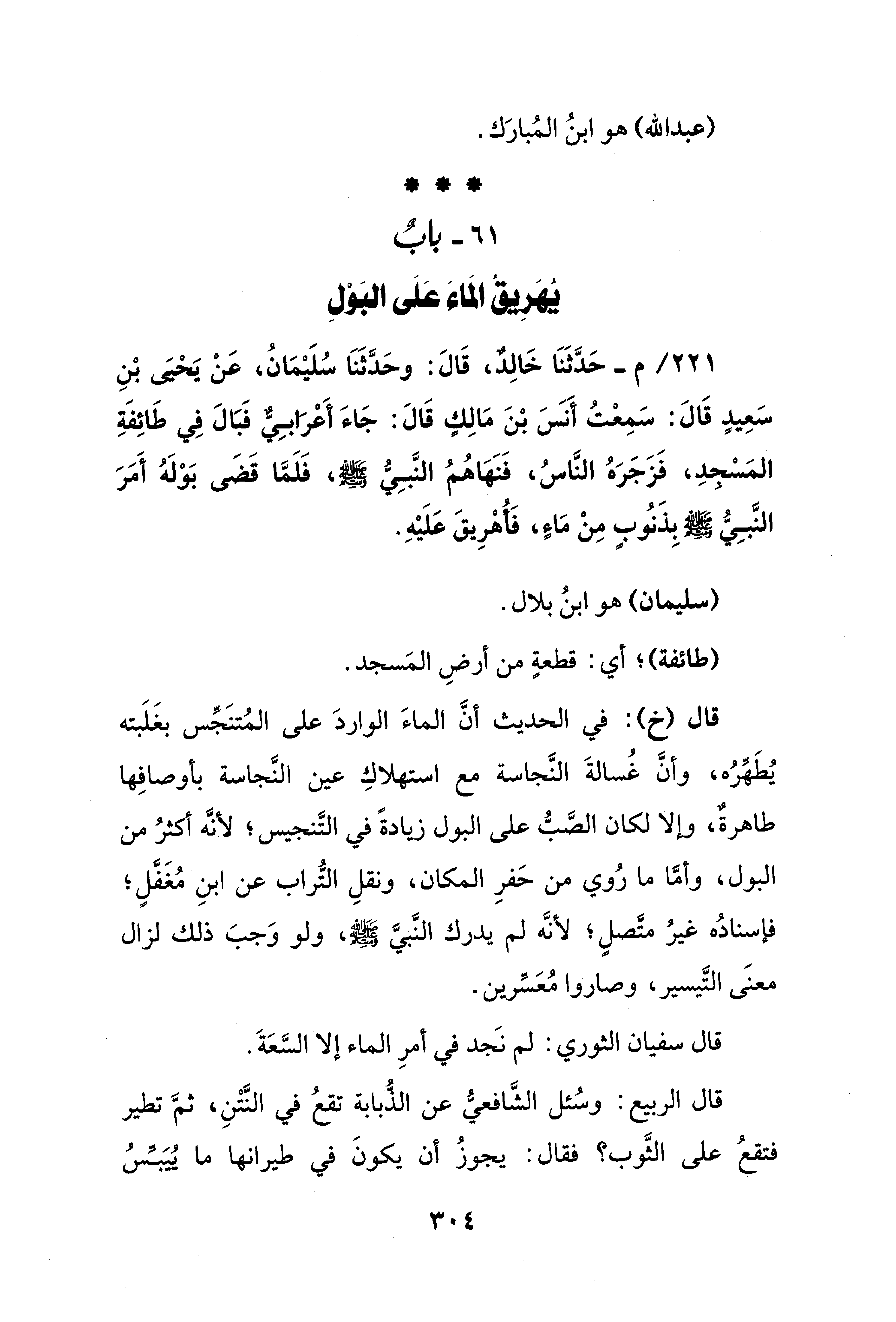 221 / -م - حَدَّثَنَا خَالدٌ، قَالَ: وحَدَّثَنَا سُلَيْمَانُ، عَنْ يَحيَى بْنِ سَعِيدٍ قَالَ: سَمِعتُ أَنس بْنَ مَالِكٍ قَالَ: جَاءَ أَعرَابِيٌّ فَبَالَ فِي طَائِفَةِ المَسْجدِ، فَزَجَرَهُ النَّاسُ، فَنَهاهُمُ النَّبِيُّ - صلى الله عليه وسلم -، فَلَمَّا قَضَى بَوْلَهُ أَمَرَ النَّبِيُّ - صلى الله عليه وسلم - بِذَنُوبٍ مِنْ مَاءٍ، فَأُهْرِيقَ عَلَيْهِ.