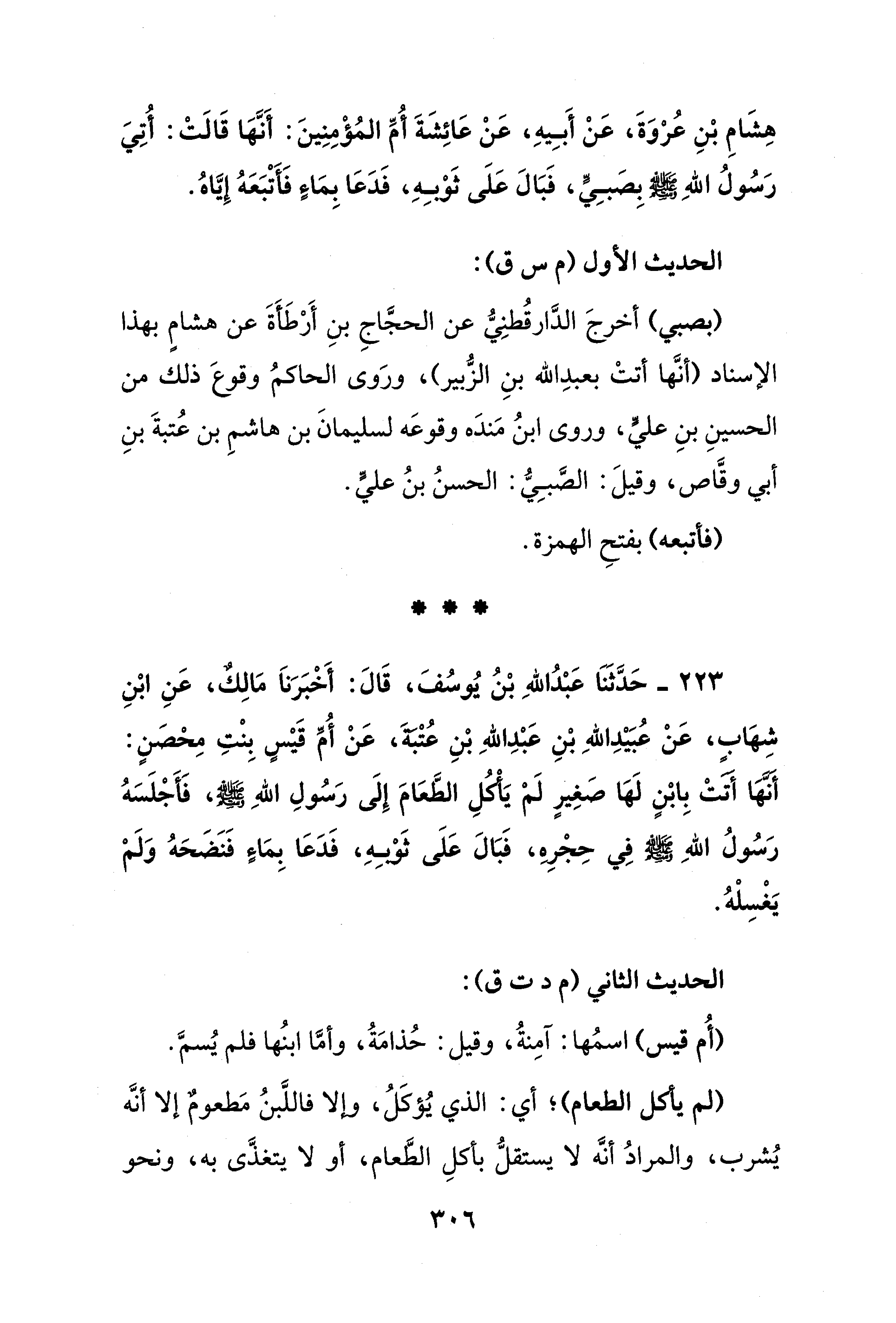 223 - حَدَّثَنَا عَبْدُ اللهِ بْنُ يُوسُفَ، قَالَ: أَخْبَرَناَ مَالِكٌ، عَنِ ابْنِ شهابٍ، عَنْ عُبَيْدِ اللهِ بْنِ عَبْدِ اللهِ بْنِ عُتْبةَ، عَنْ أُمِّ قَيْسٍ بِنْتِ مِحْصَن: أنها أتَتْ بِابْنٍ لَها صَغِيرٍ لَم يَأكُلِ الطَّعَامَ إِلَى رَسُولِ اللهِ - صلى الله عليه وسلم -، فَأَجْلَسَهُ رَسُولُ اللهِ - صلى الله عليه وسلم - فِي حِجْرِ، فَبَالَ عَلَى ثَوْبِهِ، فَدَعَا بِمَاءٍ فَنَضَحَهُ وَلَم يَغْسِلْهُ.