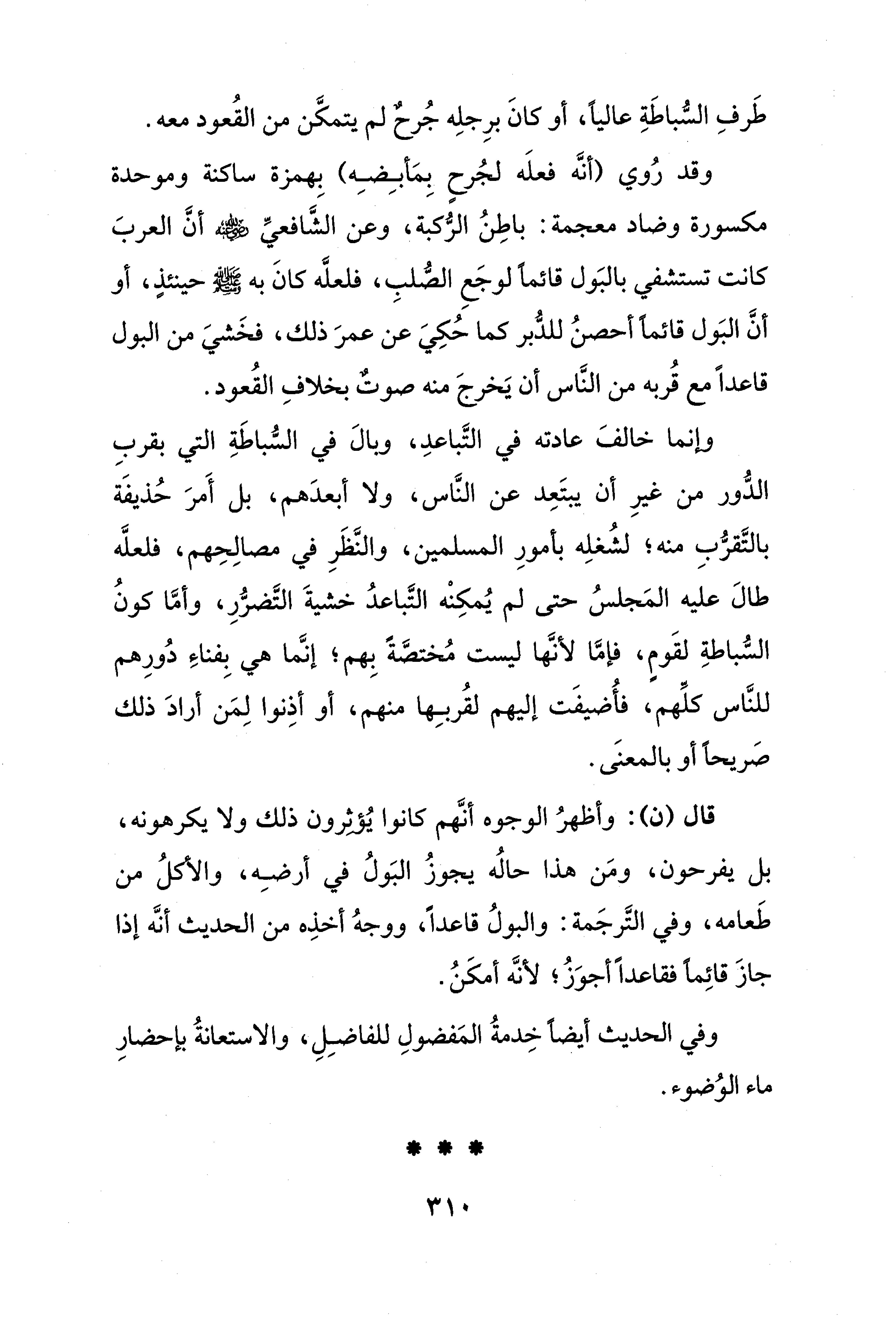 وقد رُوي (أنَّه فعلَه لجُرحٍ بِمأبِضِه) بِهمزة ساكنة وموحدة مكسورة وضاد معجمة: باطِنُ الرُّكبة، وعن الشَّافعيِّ - صلى الله عليه وسلم - أنَّ العربَ كانت تستشفي بالبَول قائمًا لوجَعِ الصُّلبِ، فلعلَّه كانَ به - صلى الله عليه وسلم - حينئذٍ، أو أنَّ البَول قائمًا أحصنُ للدُّبر كما حُكِيَ عن عمرَ ذلك، فخَشيَ من البول قاعدًا مع قُربه من النَّاس أن يَخرجَ منه صوتٌ بخلافِ القُعود.