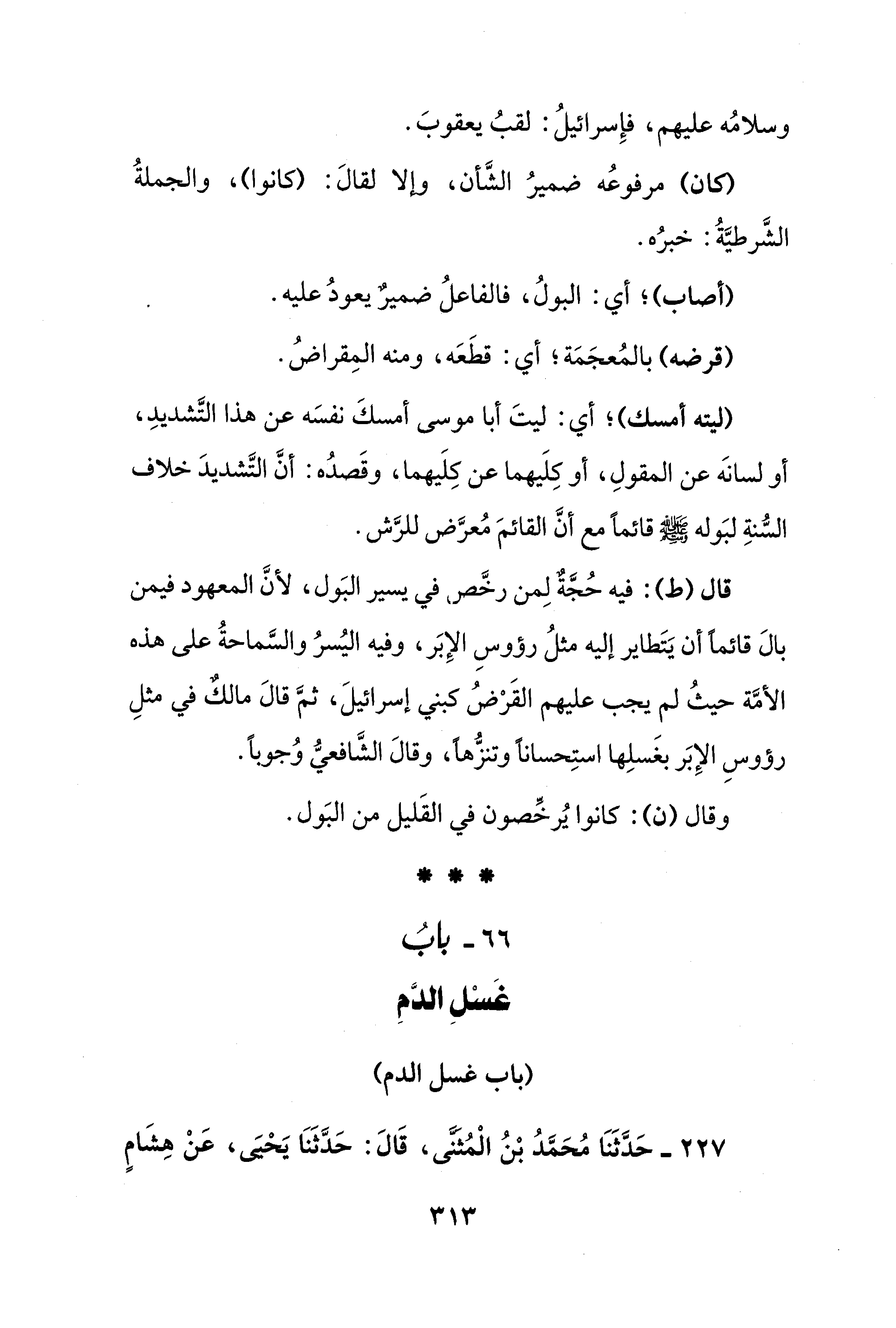 قال (ط): فيه حُجَّةٌ لِمن رخَّص في يسير البَول، لأنَّ المعهود فيمن بالَ قائمًا أن يَتَطاير إليه مثلُ رؤوسِ الإِبَر، وفيه اليُسرُ والسَّماحةُ على هذه الأمَّة حيثُ لم يجب عليهم القَرْضُ كبني إسرائيلَ، ثمَّ قالَ مالكٌ في مثلِ رؤوسِ الإِبَر بغَسلِها استِحسانًا وتنزُّهًا، وقالَ الشَّافعيُّ وُجوبًا.