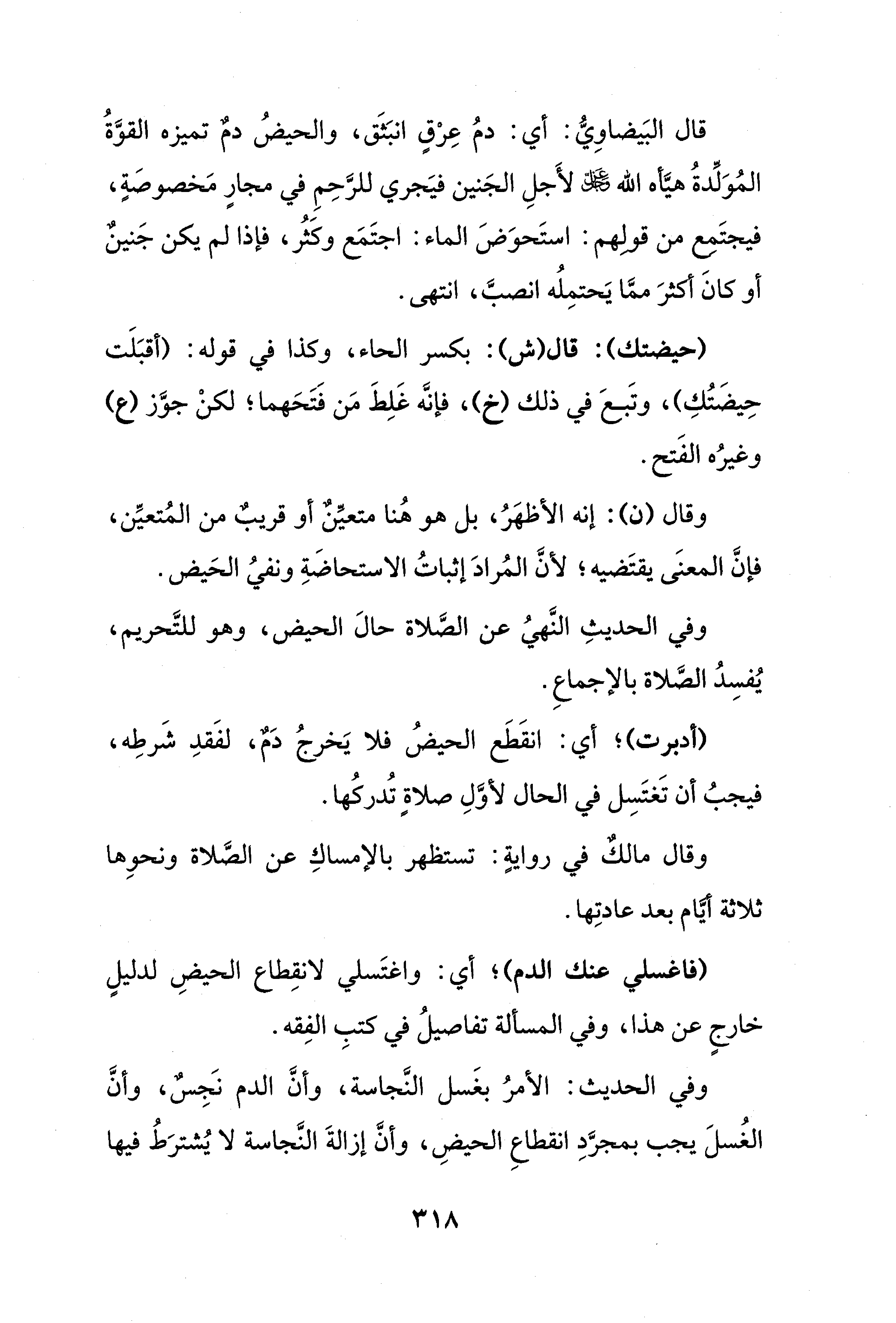 قال البَيضاوِيُّ: أي: دمُ عِرْقٍ انبَثَق، والحيضُ دمٌ تميزه القوَّةُ المُوَلِّدةُ هيَّأه الله - عز وجل - لأَجلِ الجَنين فيَجري للرَّحِمِ في مجارٍ مَخصوصَةٍ، فيجتَمِع من قولهم: استَحوَضَ الماء: اجتَمَع وكَثُر، فإذا لم يكن جَنينٌ أو كانَ أكثرَ ممَّا يَحتمِلُه انصبَّ، انتهى.