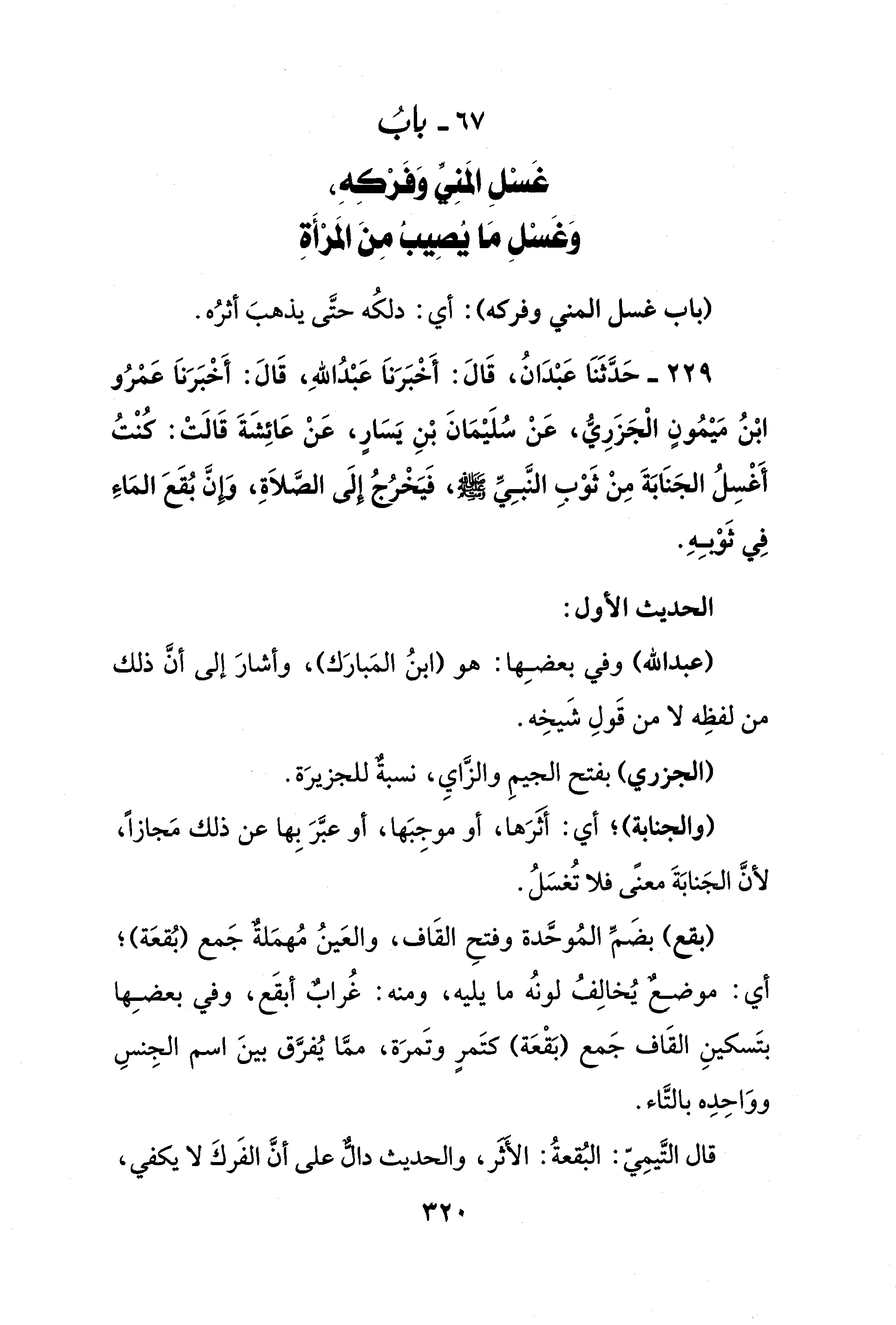 229 - حَدَّثَنَا عَبْدَانُ، قَالَ: أَخْبَرَناَ عَبْدُ اللهِ، قَالَ: أَخْبَرَناَ عَمرُو ابْنُ مَيْمُونٍ الْجَزَرِيُّ، عَنْ سُلَيْمَانَ بْنِ يَسَارٍ، عَنْ عَائِشَةَ قَالَتْ: كُنْتُ أَغْسِلُ الجَنَابَةَ مِنْ ثَوْبِ النَّبِيِّ - صلى الله عليه وسلم -، فَيَخْرُجُ إِلَى الصَّلاَةِ، وإِنَّ بُقَعَ المَاءَ فِي ثَوْبِهِ.