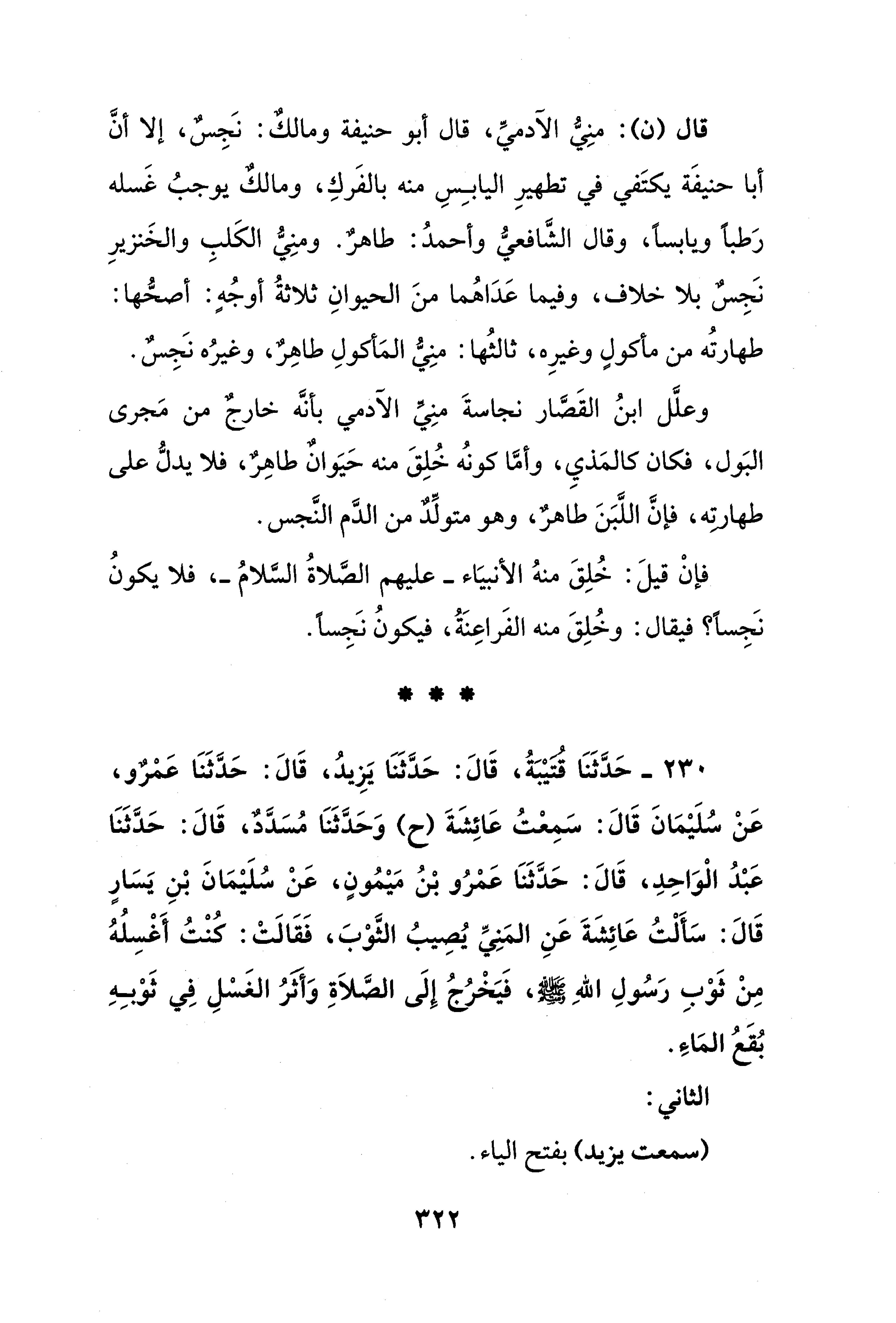 230 - حَدَّثَنَا قتيْبَةُ، قَالَ: حَدَّثَنَا يَزِيدُ، قَالَ: حَدَّثَنَا عمرٌو، عَنْ سُلَيْمَانَ قَالَ: سَمِعتُ عَائِشَةَ (ح) وَحَدَّثَنَا مُسَدَّدٌ، قَالَ: حَدَّثَنَا عَبْدُ الْوَاحِدِ، قَالَ: حَدَّثَنَا عمرُو بْنُ مَيْمُونٍ، عَنْ سُلَيْمَانَ بْنِ يَسَارٍ قَالَ: سَأَلْتُ عَائِشَةَ عَنِ المَنِيِّ يُصِيبُ الثَّوْبَ، فَقَالَتْ: كنْتُ أَغْسِلُهُ مِنْ ثَوْبِ رَسُولِ اللهِ - صلى الله عليه وسلم -، فَيَخْرُجُ إِلَى الصَّلاَةِ وَأثَرُ الغَسْلِ فِي ثَوْبِهِ بُقَعُ المَاءِ.