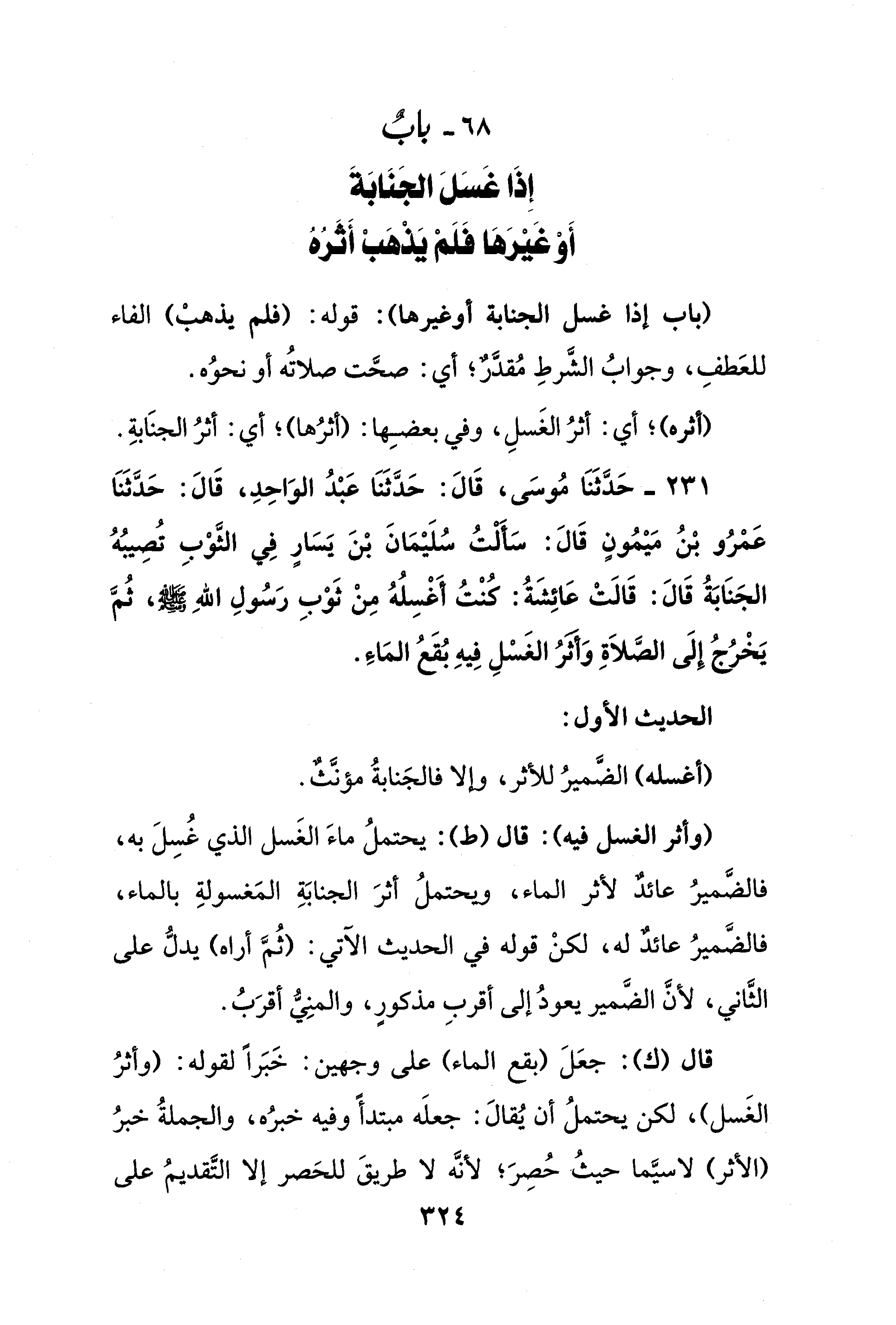 231 - حَدَّثَنَا مُوسَى، قَالَ: حَدَّثَنَا عَبْدُ الوَاحِدِ، قَالَ: حَدَّثَنَا عَمرُو بْنُ مَيْمُونٍ قَالَ: سَأَلْتُ سُلَيْمَانَ بْنَ يَسَارٍ فِي الثَّوْبِ تُصِيبُهُ الجَنَابَةُ قَالَ: قَالَتْ عَائِشَةُ: كُنْتُ أَغْسِلُهُ مِنْ ثَوْبِ رَسُولِ اللهِ - صلى الله عليه وسلم -، ثُمَّ يَخْرُجُ إِلَى الصَّلاَةِ وَأثَرُ الغَسْلِ فِيهِ بُقَعُ المَاءِ.