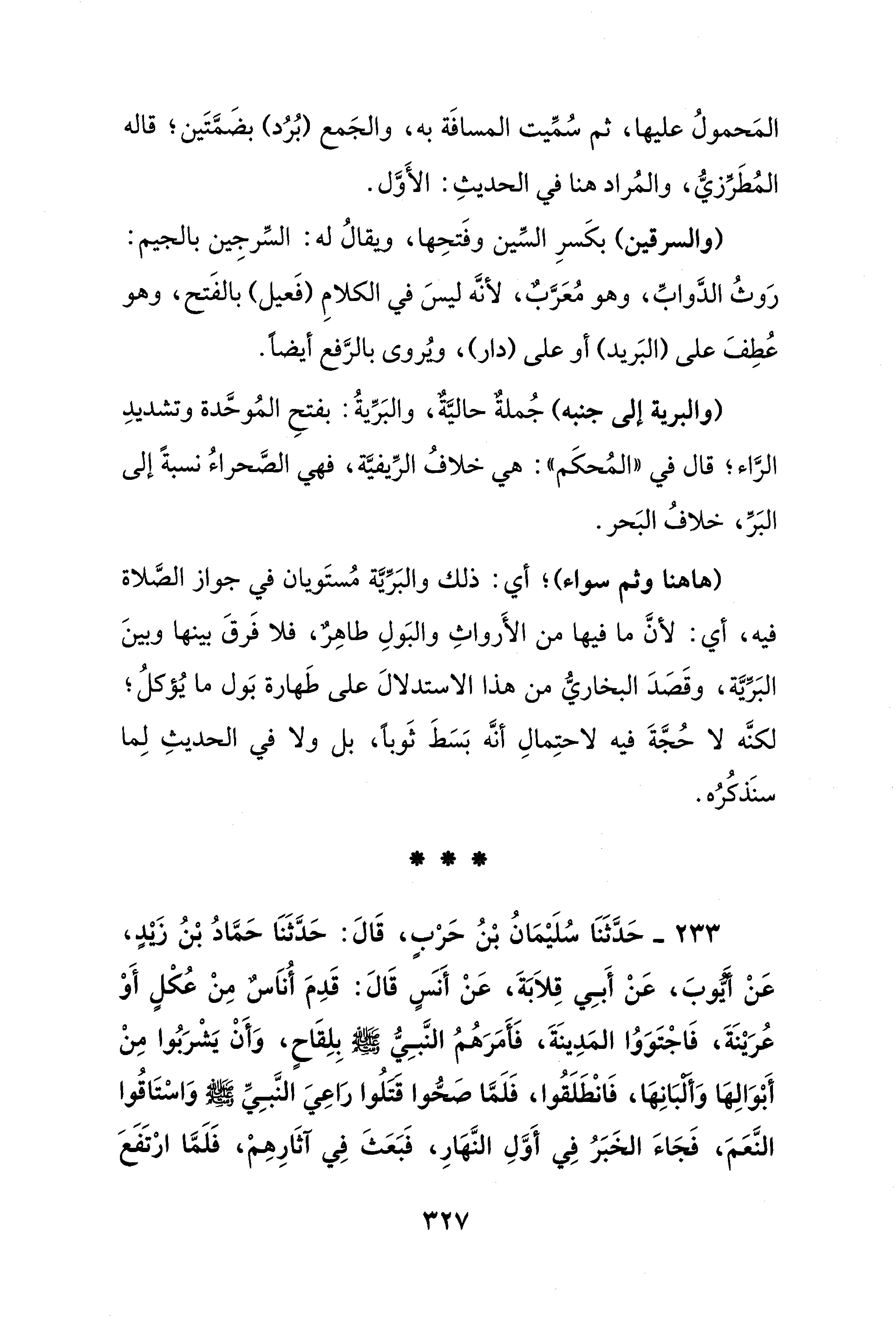 233 - حَدَّثَنَا سُلَيْمَانُ بْنُ حَربٍ، قَالَ: حَدَّثَنَا حَمَّادُ بْنُ زَيْدٍ، عَنْ أيوبَ، عَنْ أَبِي قِلاَبَةَ، عَنْ أَنسٍ قَالَ: قَدِمَ أُناَسٌ مِنْ عُكْلٍ أَوْ عُرَيْنَةَ، فَاجْتَوَوُا المَدِينَةَ، فَأمَرَهُمُ النَّبِيُّ - صلى الله عليه وسلم - بِلِقَاحٍ، وَأَنْ يَشْربُوا مِنْ أَبْوَالِها وَألبَانها، فَانْطَلَقُوا، فَلَمَّا صَحُّوا قتلُوا رَاعيَ النَّبِيِّ - صلى الله عليه وسلم - وَاسْتَاقُوا النَّعَمَ، فَجَاءَ الخَبَرُ فِي أَوَّلِ النهارِ، فَبَعَثَ فِي آثَارِهم، فَلَمَّا ارْتَفَعَ