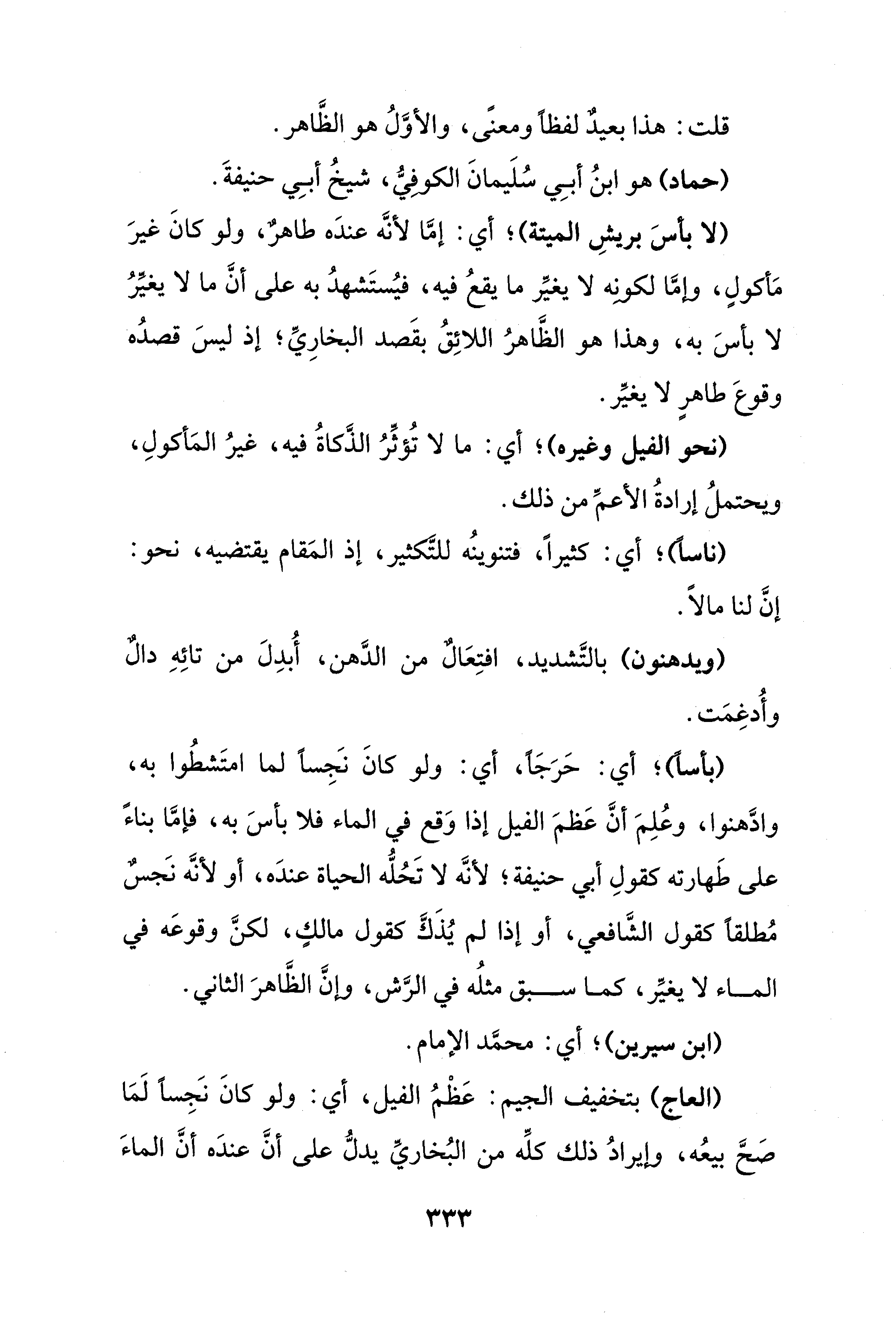 (نحو الفيل وغيره)؛ أي: ما لا تُؤثِّرُ الذَّكاةُ فيه، غيرُ المَأكولِ، ويحتملُ إرادةُ الأعمِّ من ذلك.