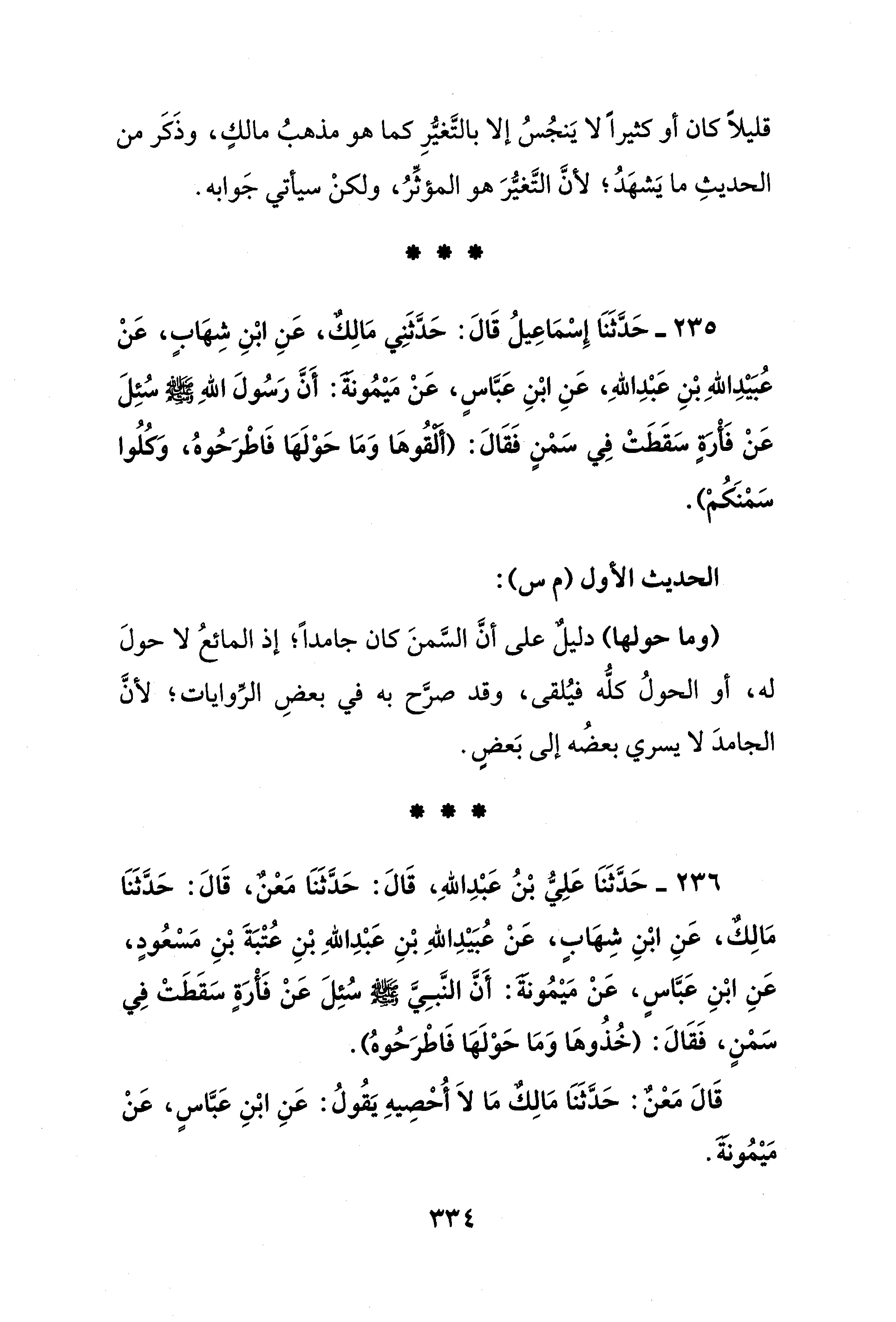 235 - حَدَّثَنَا إِسْمَاعِيلُ قَالَ: حَدَّثَنِي مَالكٌ، عَنِ ابْنِ شِهابٍ، عَنْ عُبَيْدِ اللهِ بنِ عَبْدِ اللهِ، عَنِ ابنِ عَبَّاسٍ، عَنْ مَيمُونة: أَنَّ رَسُولَ اللهِ - صلى الله عليه وسلم - سُئِلَ عَنْ فَأرةٍ سَقَطَتْ فِي سَمنٍ فَقَالَ: (ألقُوها وَمَا حَوْلَها فَاطْرَحُوهُ، وَكُلُوا سَمْنَكُمْ).