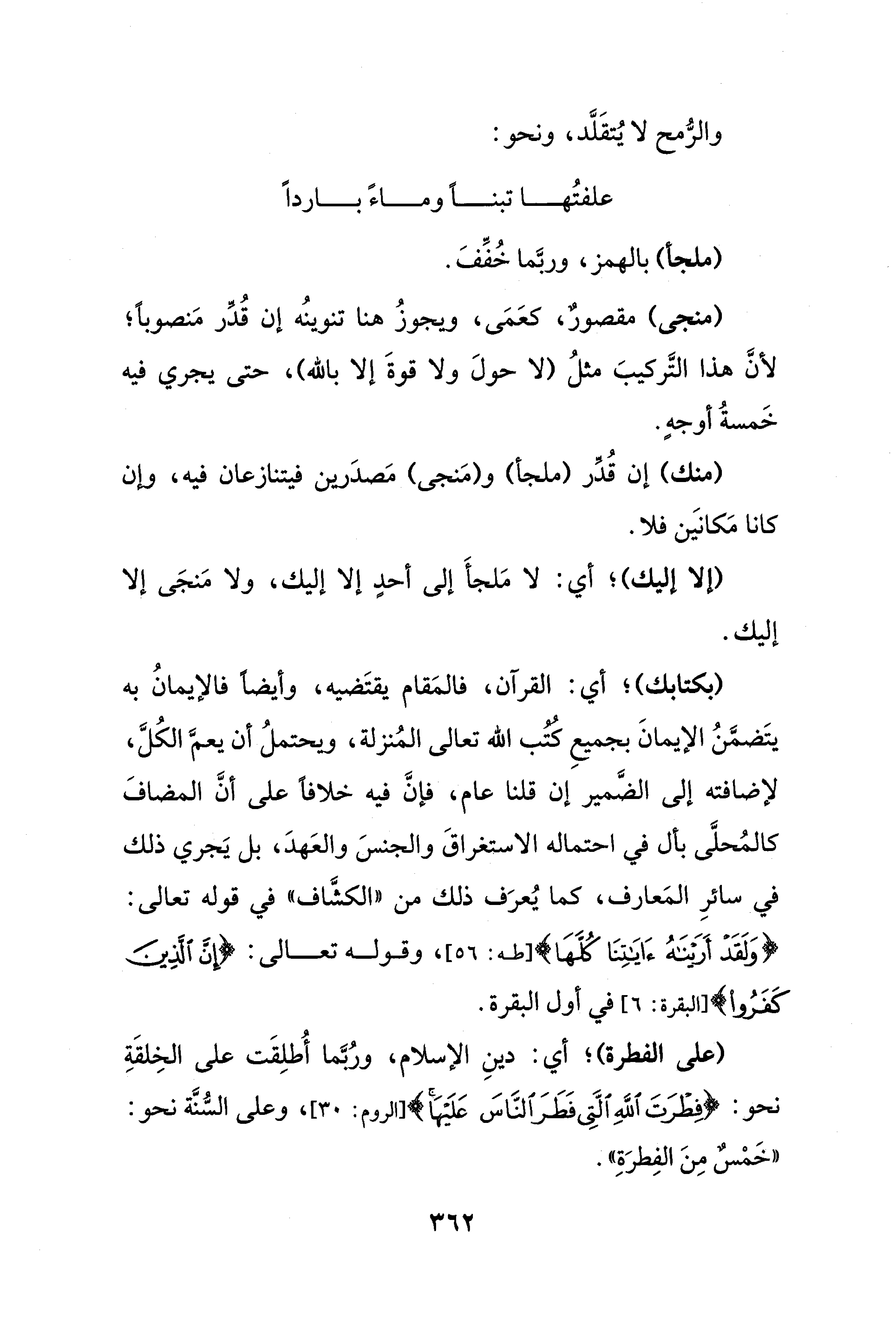 (بكتابك)؛ أي: القرآن، فالمَقام يقتَضيه، وأيضًا فالإيمانُ به يتَضمَّنُ الإيمانَ بجميعِ كتب الله تعالى المُنزلة، ويحتملُ أن يعمَّ الكُلَّ، لإضافته إلى الضَّمير إن قلنا عام، فإنَّ فيه خلافًا على أنَّ المضافَ كالمُحلَّى بأل في احتماله الاستغراقَ والجنسَ والعَهدَ، بل يَجري ذلك في سائرِ المَعارف، كما يُعرَف ذلك من "الكشَّاف" في قوله تعالى: {وَلَقَدْ أَرَيْنَاهُ آيَاتِنَا كُلَّهَا} [طه: 56]، وقوله تعالى: {إِنَّ الَّذِينَ كَفَرُوا} [البقرة: 6] في أول البقرة.