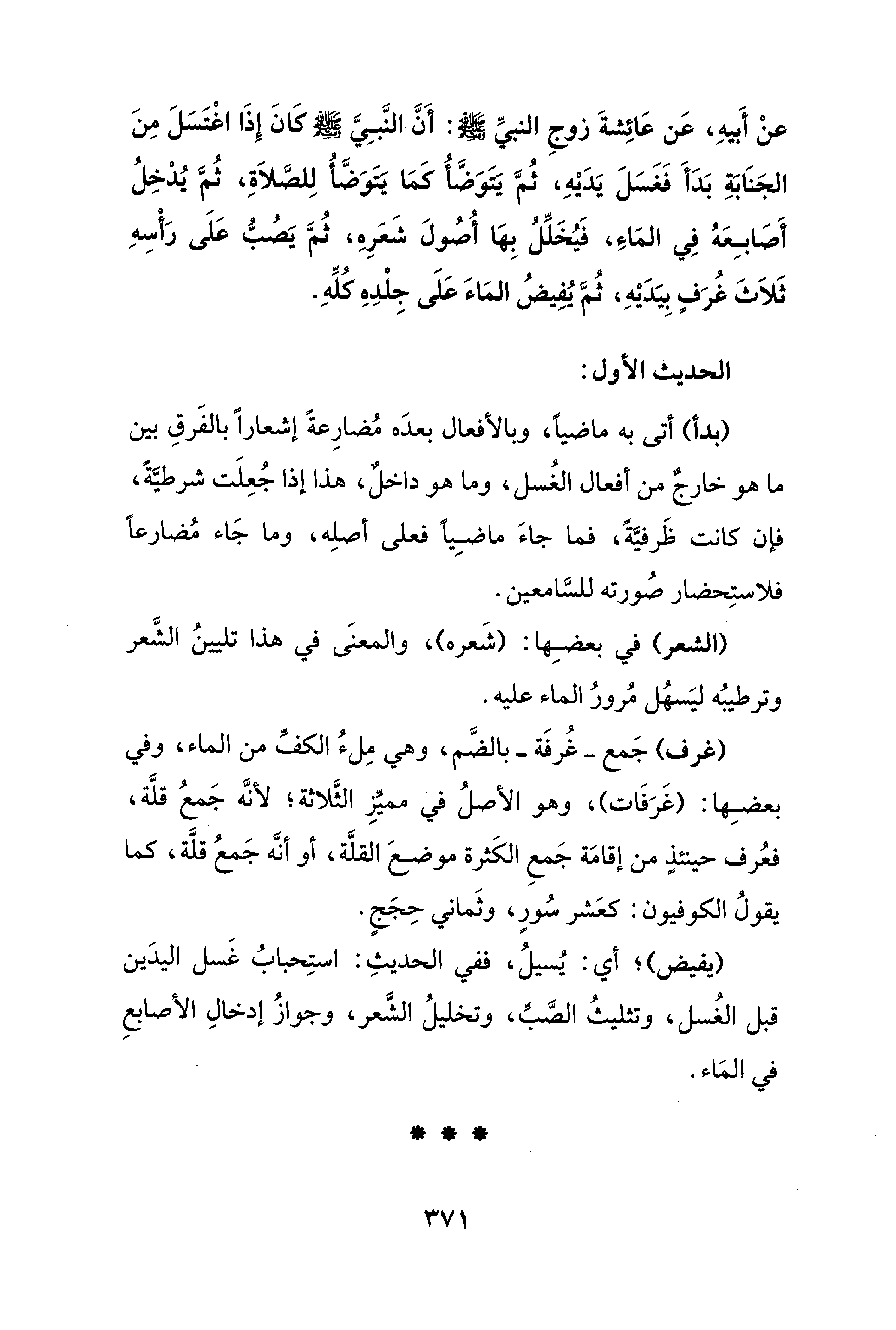 (الشعر) في بعضِها: (شَعره)، والمعنَى في هذا تليينُ الشَّعر وترطيبُه ليَسهُل مُرورُ الماء عليه.