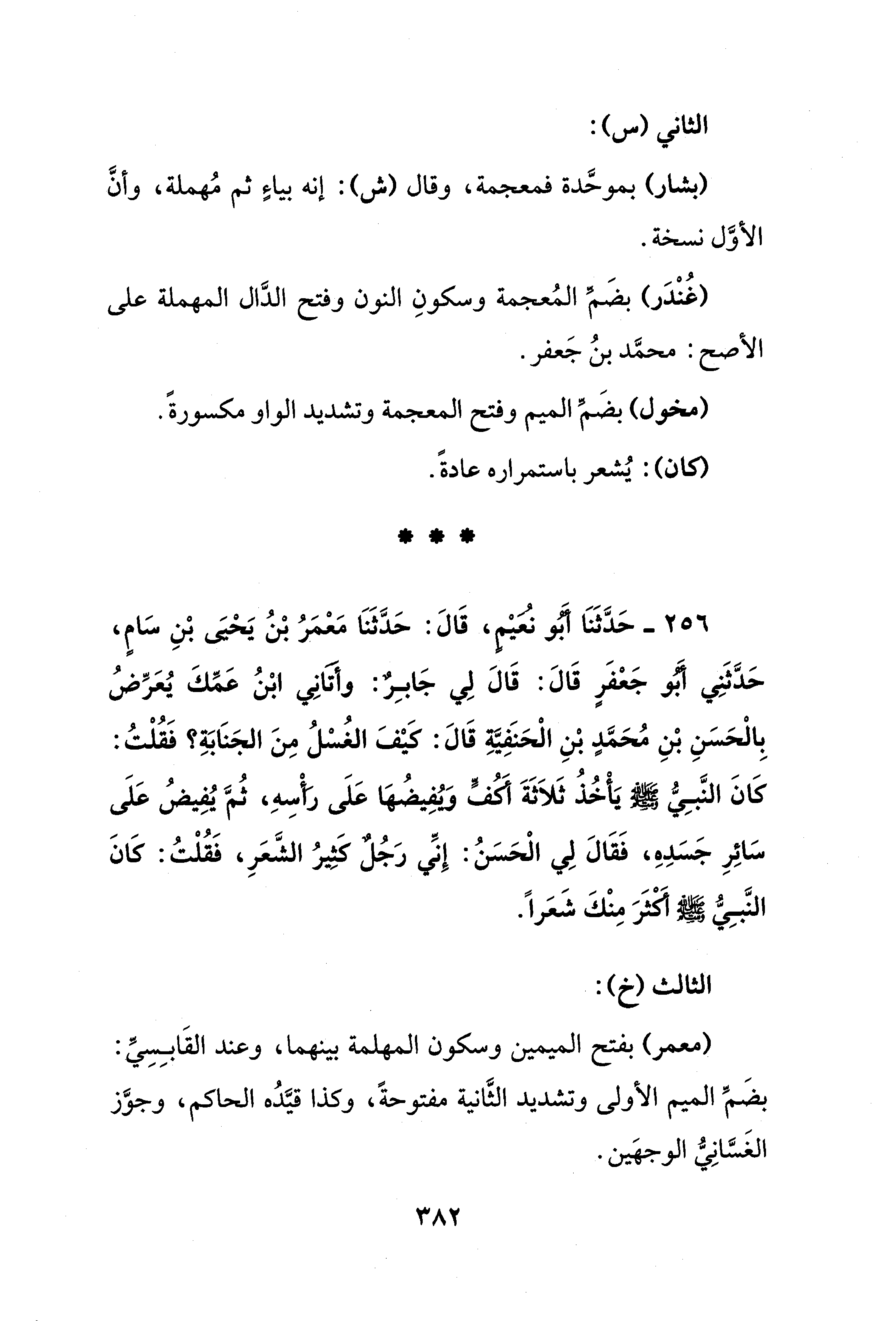 256 - حَدَّثَنَا أبُو نُعَيْمٍ، قَالَ: حَدَّثَنَا مَعْمَرُ بْنُ يَحْيَى بْنِ سَامٍ، حَدَّثَنِي أَبُو جَعْفَرٍ قَالَ: قَالَ لِي جَابِرٌ: وأَتَانِي ابْنُ عَمِّكَ يُعَرِّضُ بِالْحَسَنِ بْنِ مُحَمَّدٍ بنِ الْحَنَفِيَّةِ قَالَ: كيْفَ الغُسْلُ مِنَ الجَنَابَةِ؟ فَقُلْتُ: كَانَ النَّبِيُّ - صلى الله عليه وسلم - يَأْخُذُ ثَلَاثَةَ أكُفٍّ ويُفِيضُهَا عَلَى رَأْسِهِ، ثُمَّ يُفِيضُ عَلَى سَائِرِ جَسَدِهِ، فَقَالَ لِي الْحَسَنُ: إِنِّي رَجُلٌ كَثيرُ الشَّعَرِ، فَقُلْتُ: كَانَ النَّبِيّ - صلى الله عليه وسلم - أَكثَرَ مِنْكَ شَعَرًا.