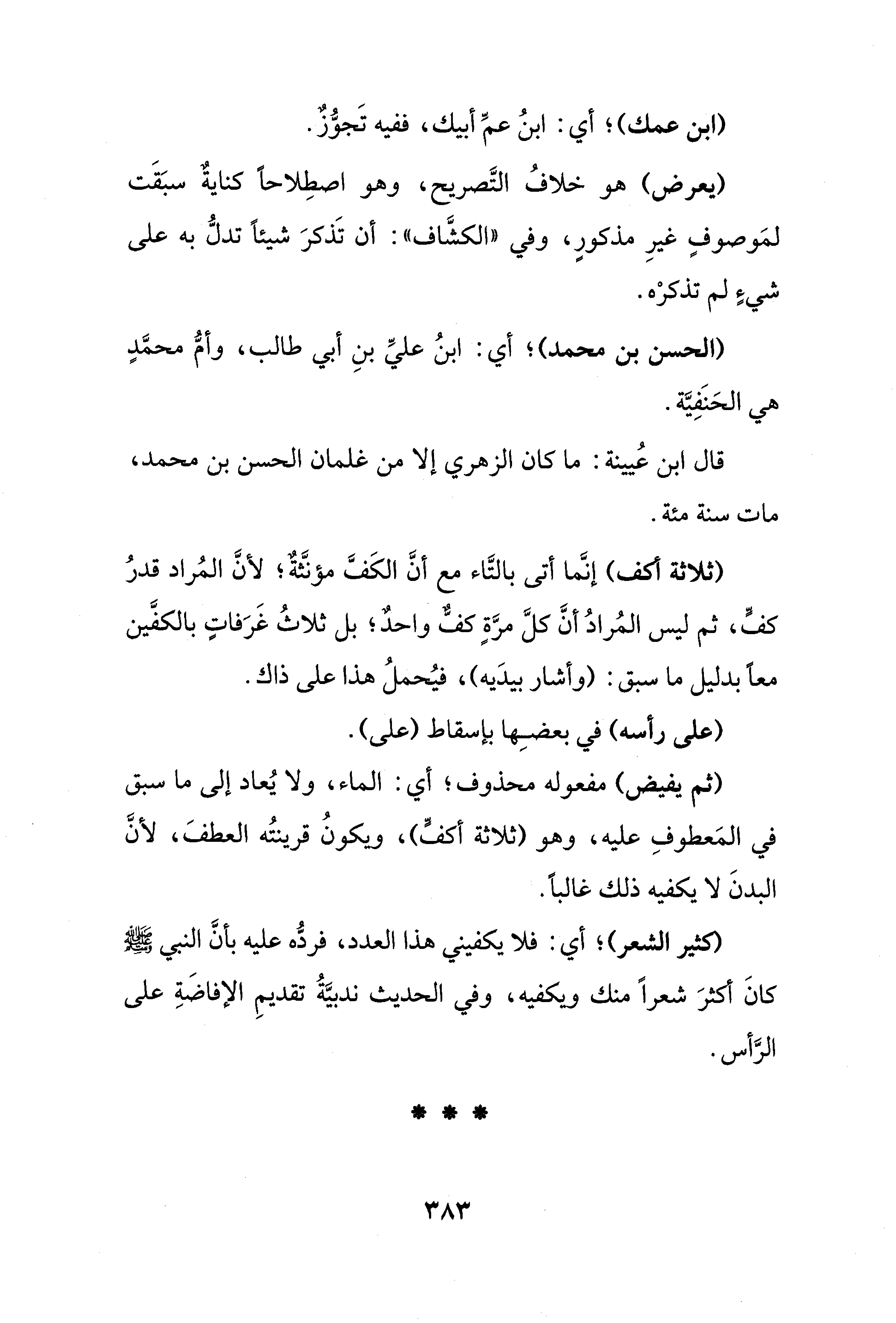 (ثلاثة أكف) إنَّما أتى بالتَّاء مع أنَّ الكَفَّ مؤنَّثةٌ؛ لأنَّ المُراد قدرُ كفٍّ، ثم ليس المُرادُ أنَّ كلَّ مرَّةٍ كفٌّ واحدٌ؛ بل ثلاثُ غَرَفاتٍ بالكفَّين معًا بدليل ما سبق: (وأشار بيدَيه)، فيُحملُ هذا على ذاك.