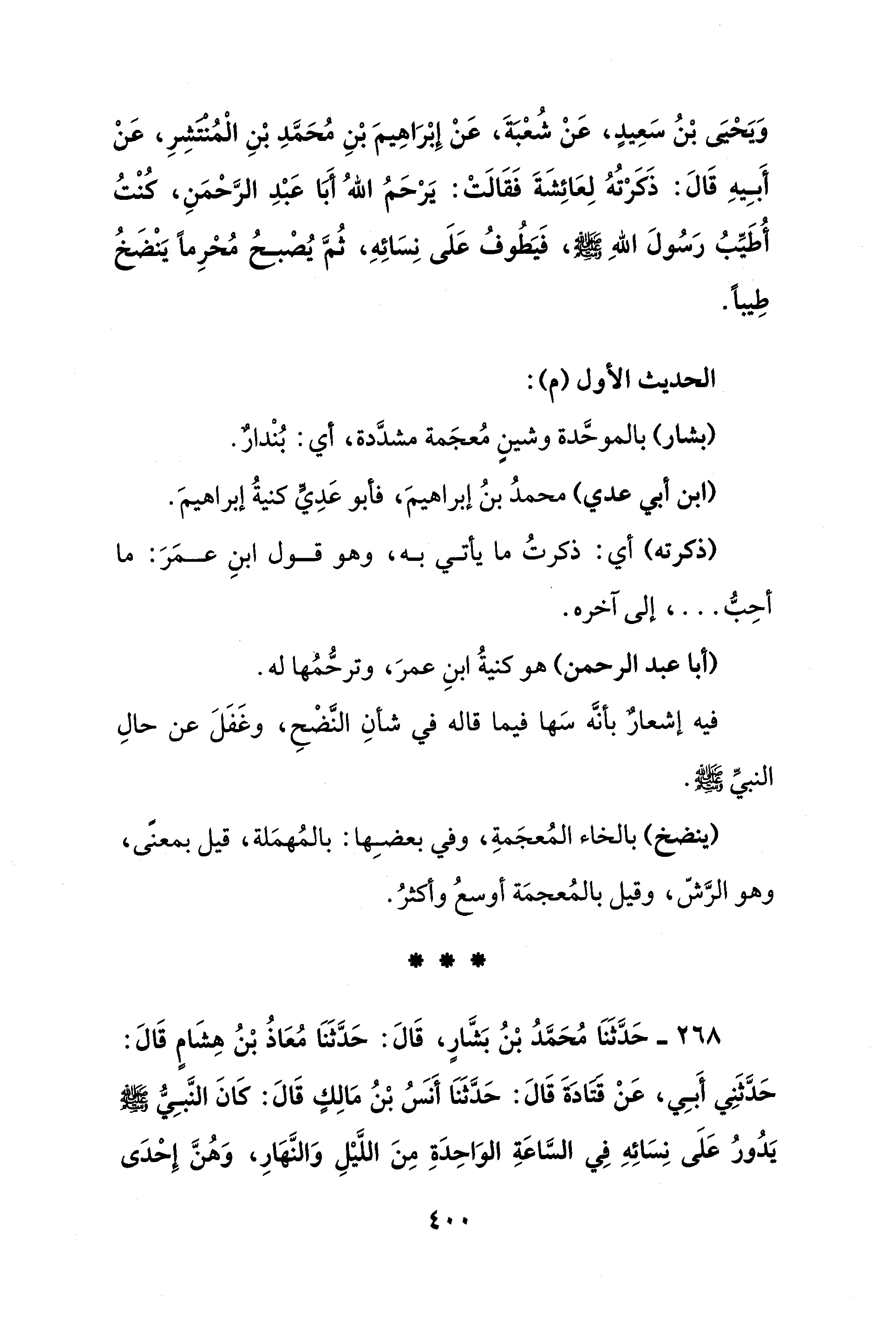 وَيَحْيَى بْنُ سَعِيدٍ، عَنْ شُعْبَةَ، عَنْ إِبْرَاهِيمَ بْنِ مُحَمَّدِ بْنِ الْمُنْتَشِرِ، عَنْ أَبِيهِ قَالَ: ذَكَرْتُهُ لِعَائِشَةَ فَقَالَتْ: يَرْحَمُ اللهُ أَبَا عَبْدِ الرَّحْمَنِ، كنْتُ أُطَيِّبُ رَسُولَ اللهِ - صلى الله عليه وسلم -، فَيَطُوفُ عَلَى نِسَائِهِ، ثُمَّ يُصْبحُ مُحْرِمًا يَنْضَخُ طِيبًا.