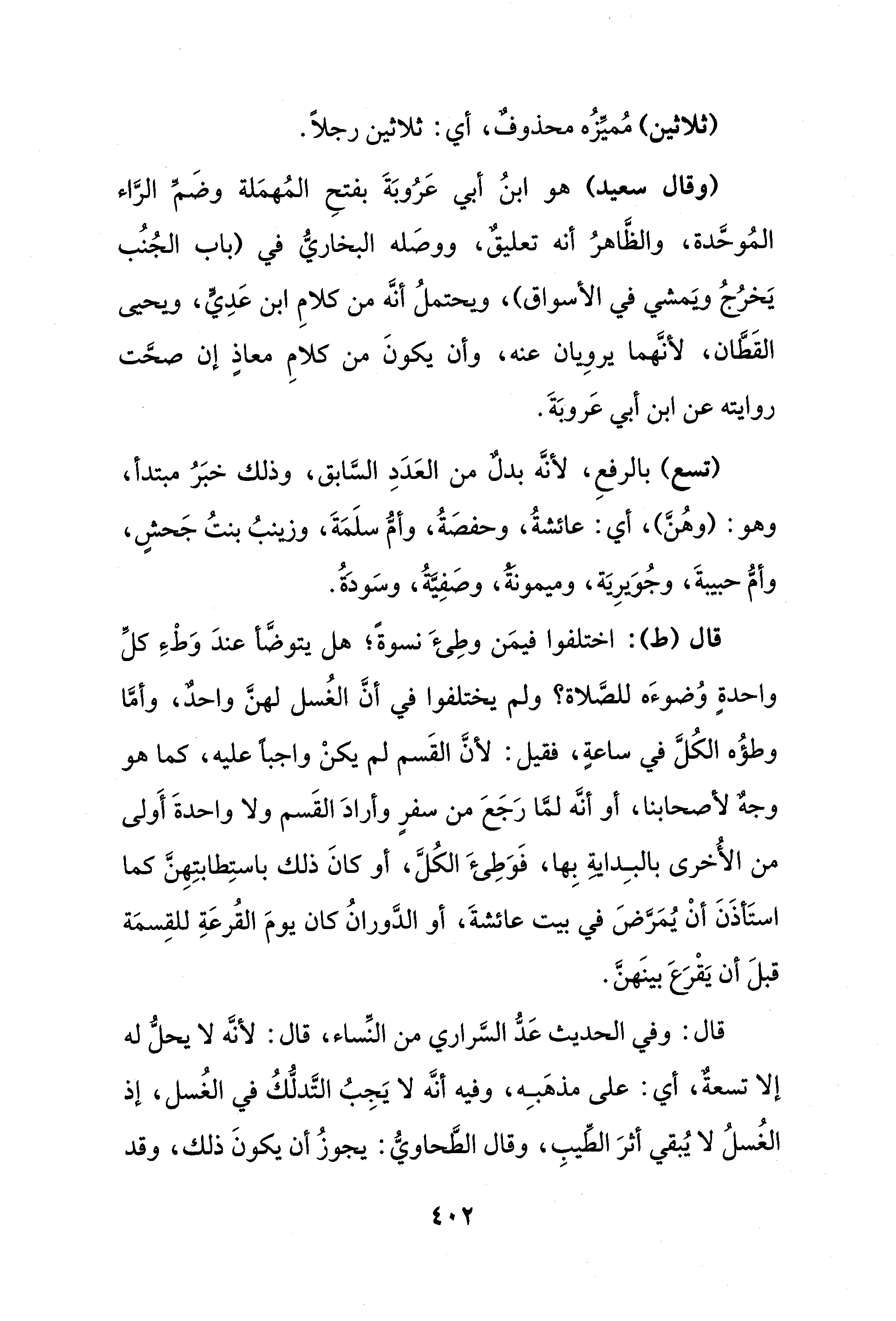 قال: وفي الحديث عَدُّ السَّراري من النِّساء، قال: لأنَّه لا يحلُّ له إلَّا تسعةٌ، أي: على مذهَبِه، وفيه أنَّه لا يَجِبُ التَّدلُّكُ في الغُسل، إذ الغُسلُ لا يُبقي أثرَ الطِّيبِ، وقال الطَّحاويُّ: يجوزُ أن يكونَ ذلك، وقد