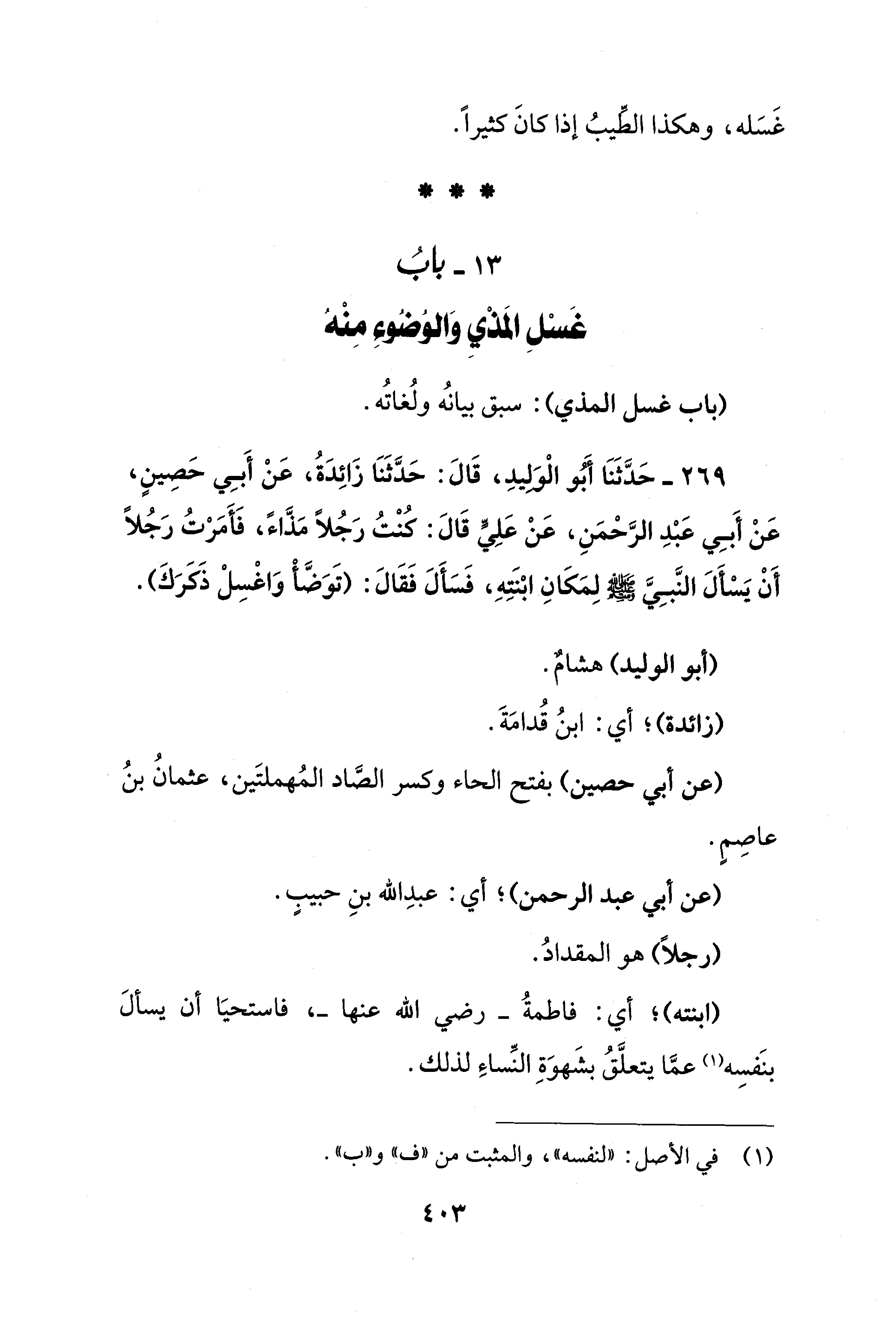 269 - حَدَّثَنَا أَبو الْوَليدِ، قَالَ: حَدَّثَنَا زَائِدَةُ، عَنْ أَبِي حَصِينٍ، عَنْ أَبِي عَبْدِ الرَّحْمَنِ، عَنْ عَلِيٍّ قَالَ: كُنْتُ رَجُلًا مَذَّاءً، فَأَمَرْتُ رَجُلًا أَنْ يَسْأَلَ النَّبِيَّ - صلى الله عليه وسلم - لِمَكَانِ ابْنَتِهِ، فَسَأَلَ فَقَالَ: (تَوَضَّأْ وَاغْسِلْ ذَكَرَكَ).