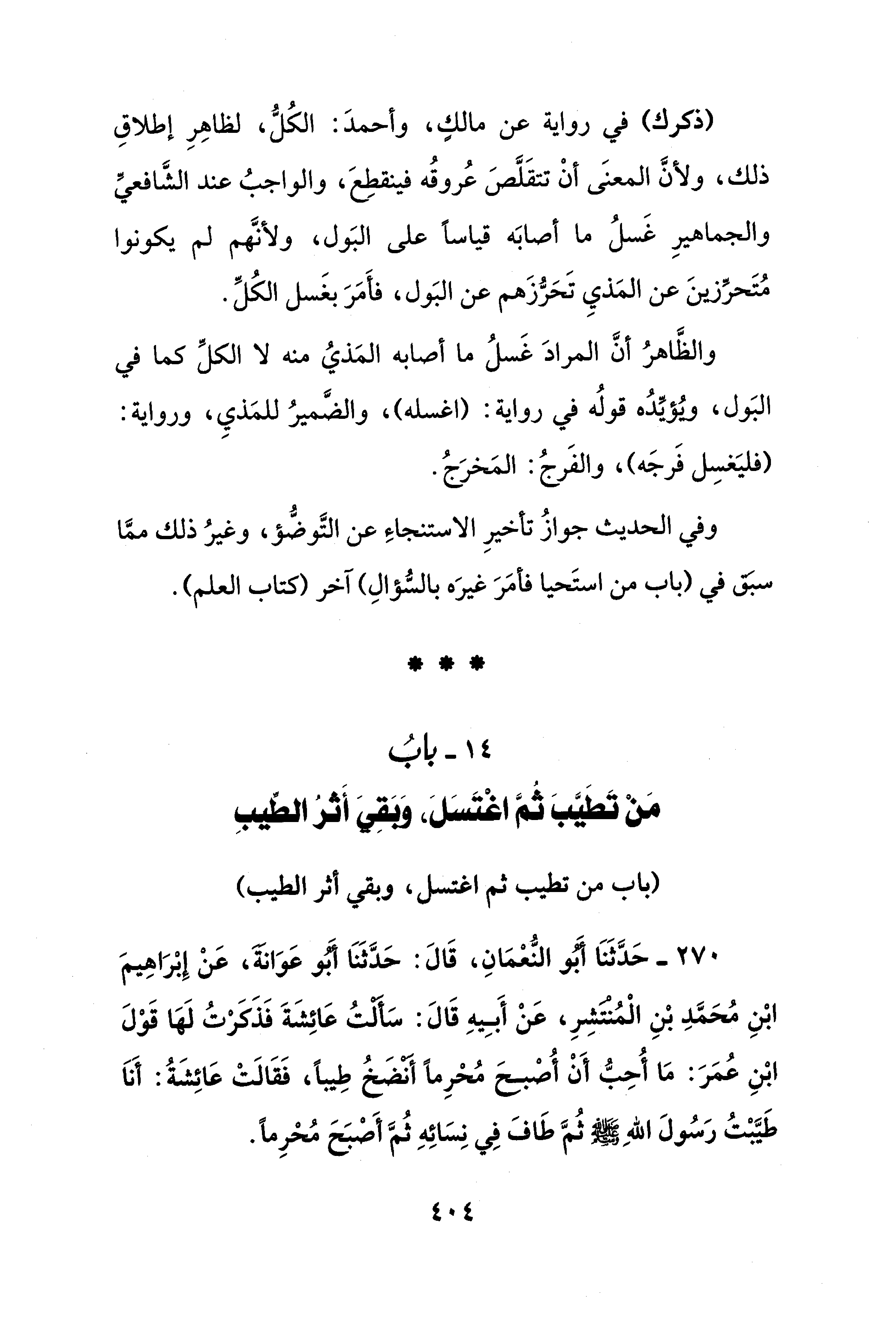 14 - بابُ مَنْ تَطَيَّبَ ثُمَّ اغْتَسَلَ، وَلَقِيَ أَثرُ الطِّيبِ