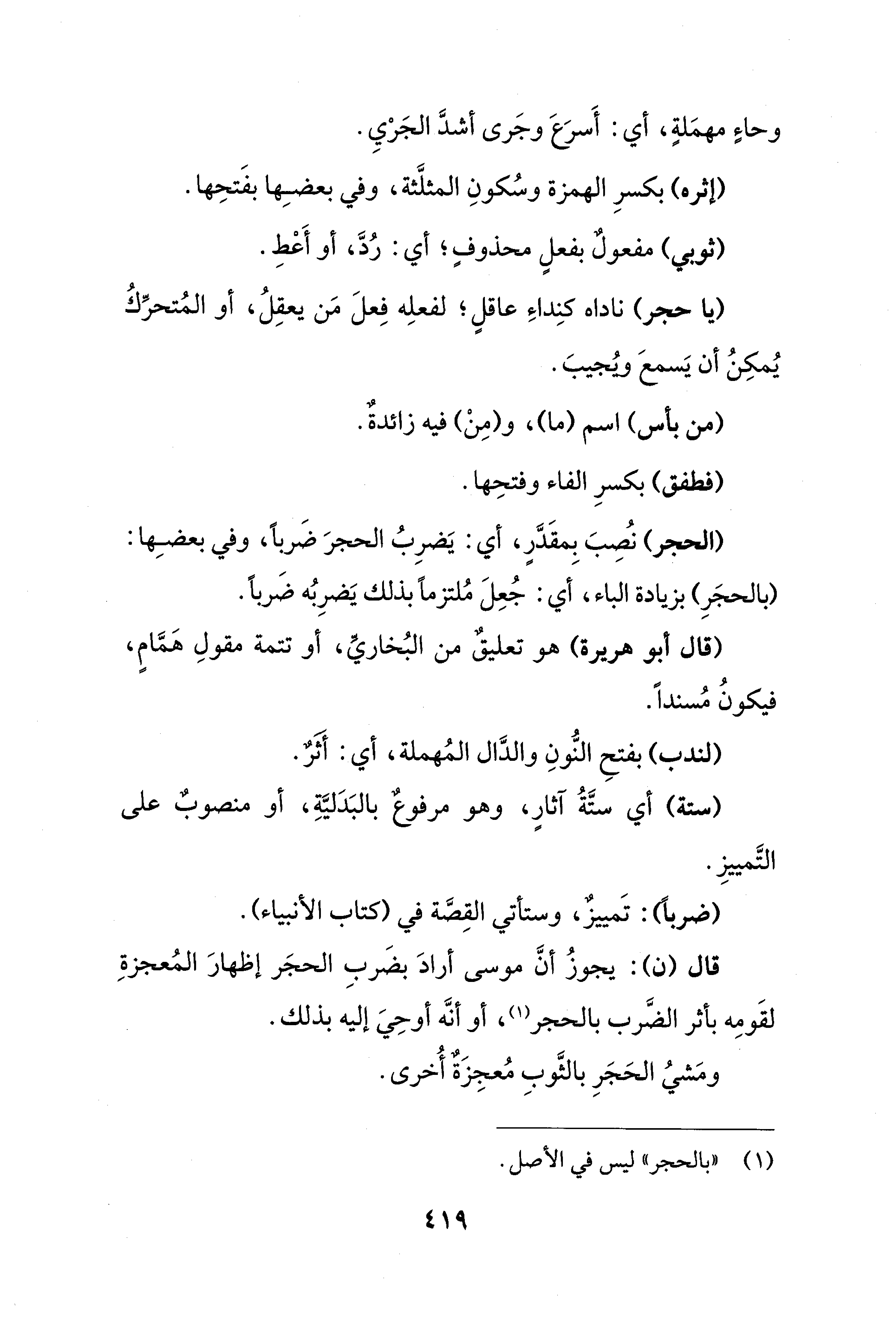(يَا حجر) ناداه كنِداءِ عاقلٍ؛ لفعلِه فِعلَ مَن يعقِلُ، أو المُتحرِّكُ يُمكِنُ أن يَسمعَ ويُجيبَ.