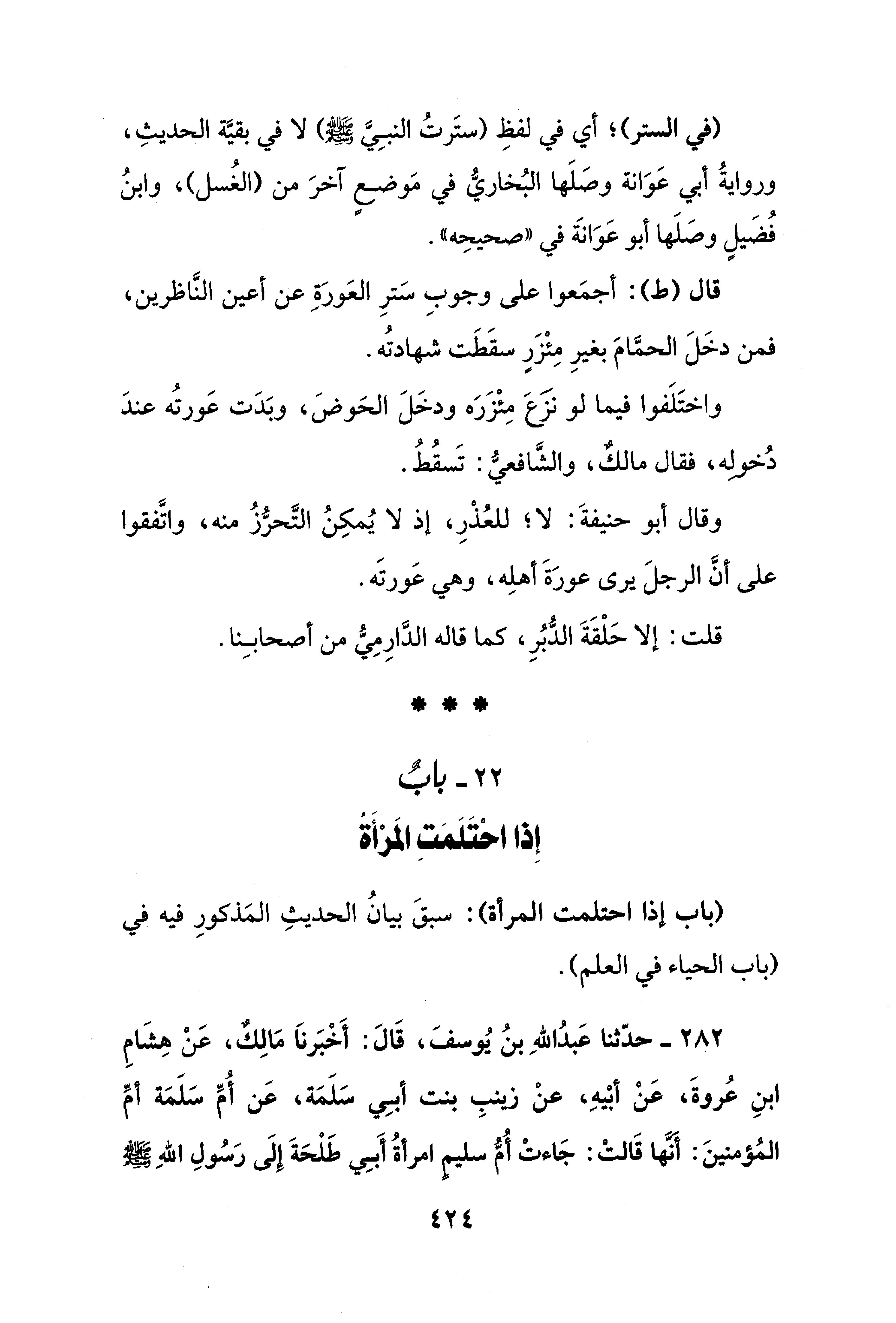 282 - حدَّثنا عَبدُ اللهِ بنُ يُوسفَ، قَالَ: أَخْبَرناَ مَالكٌ، عَنْ هِشَامِ ابنِ عُروةَ، عَنْ أبْيهِ، عنْ زينبِ بنت أبِي سَلَمَة، عَن أُمِّ سَلَمَة أمِّ المُؤمنينَ: أنَّها قَالتْ: جَاءتْ أُمُّ سليمٍ امرأةُ أَبِي طَلْحَةَ إِلَى رَسُولِ اللهِ - صلى الله عليه وسلم -