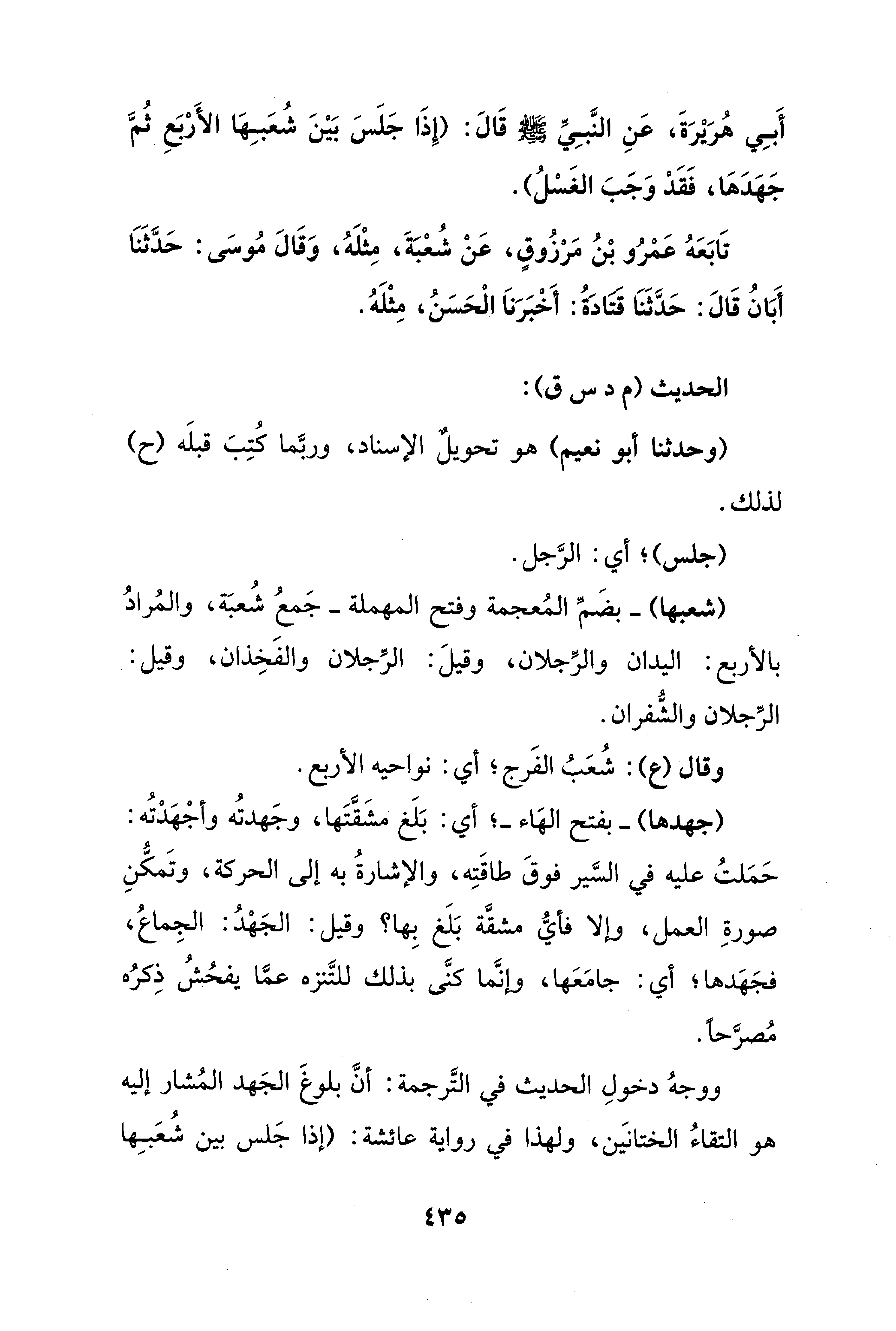 أَبِي هُرَيْرَةَ، عَنِ النَّبِيِّ - صلى الله عليه وسلم - قَالَ: (إِذَا جَلَسَ بَيْنَ شُعَبِهَا الأربَعِ ثُمَّ جَهَدَهَا، فَقد وَجَبَ الغَسْل).