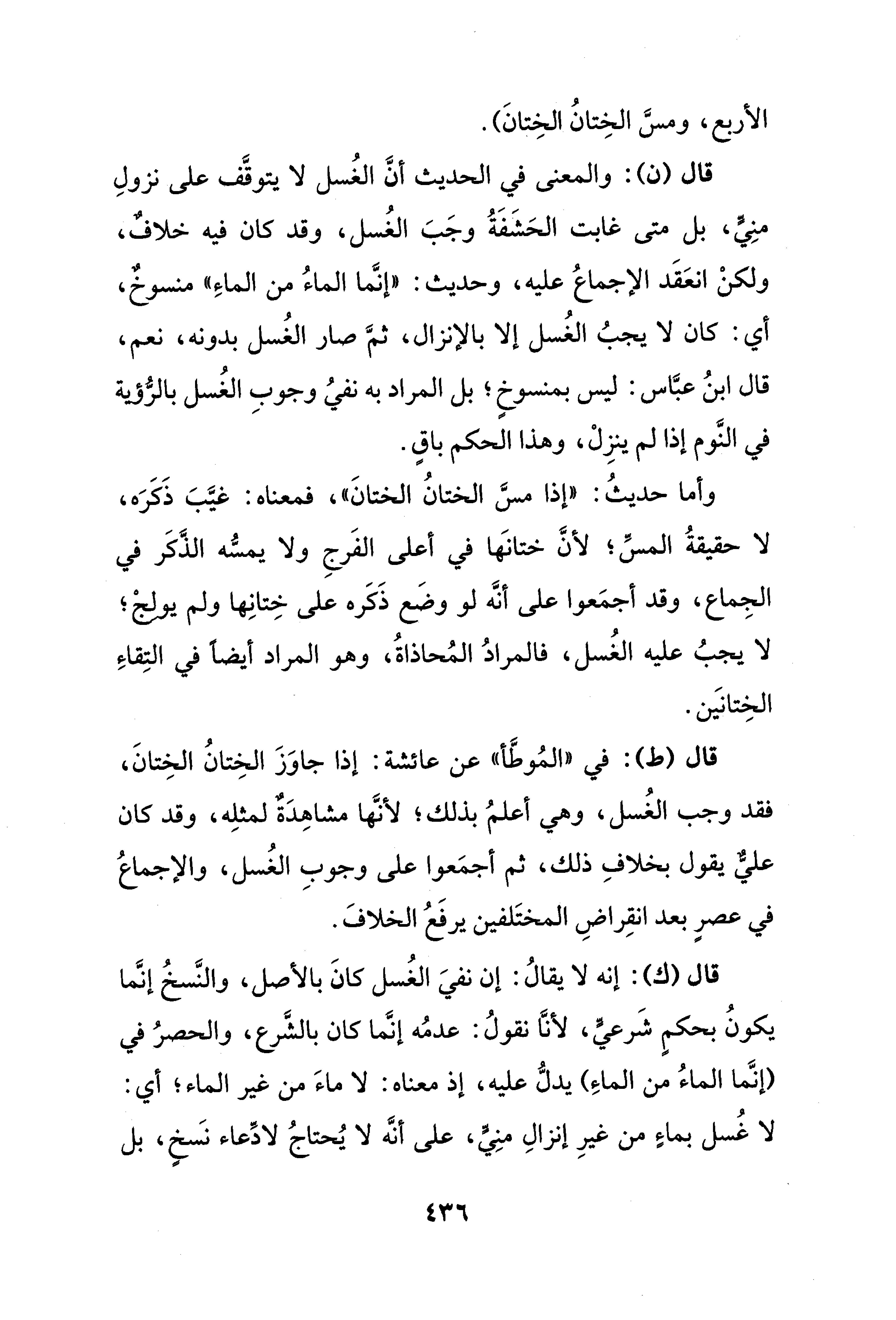 قال (ك): إنه لا يقالُ: إن نفيَ الغُسل كانَ بالأصل، والنَّسخُ إنَّما يكونُ بحكمٍ شَرعيٍّ، لأنَّا نقولُ: عدمُه إنَّما كان بالشَّرع، والحصرُ في (إنَّما الماءُ من الماءِ) يدلُّ عليه، إذ معناه: لا ماءَ من غير الماء؛ أي: لا غُسل بماءٍ من غيرِ إنزالِ منِيٍّ، على أنَّه لا يُحتاجُ لادِّعاء نسَخٍ، بل