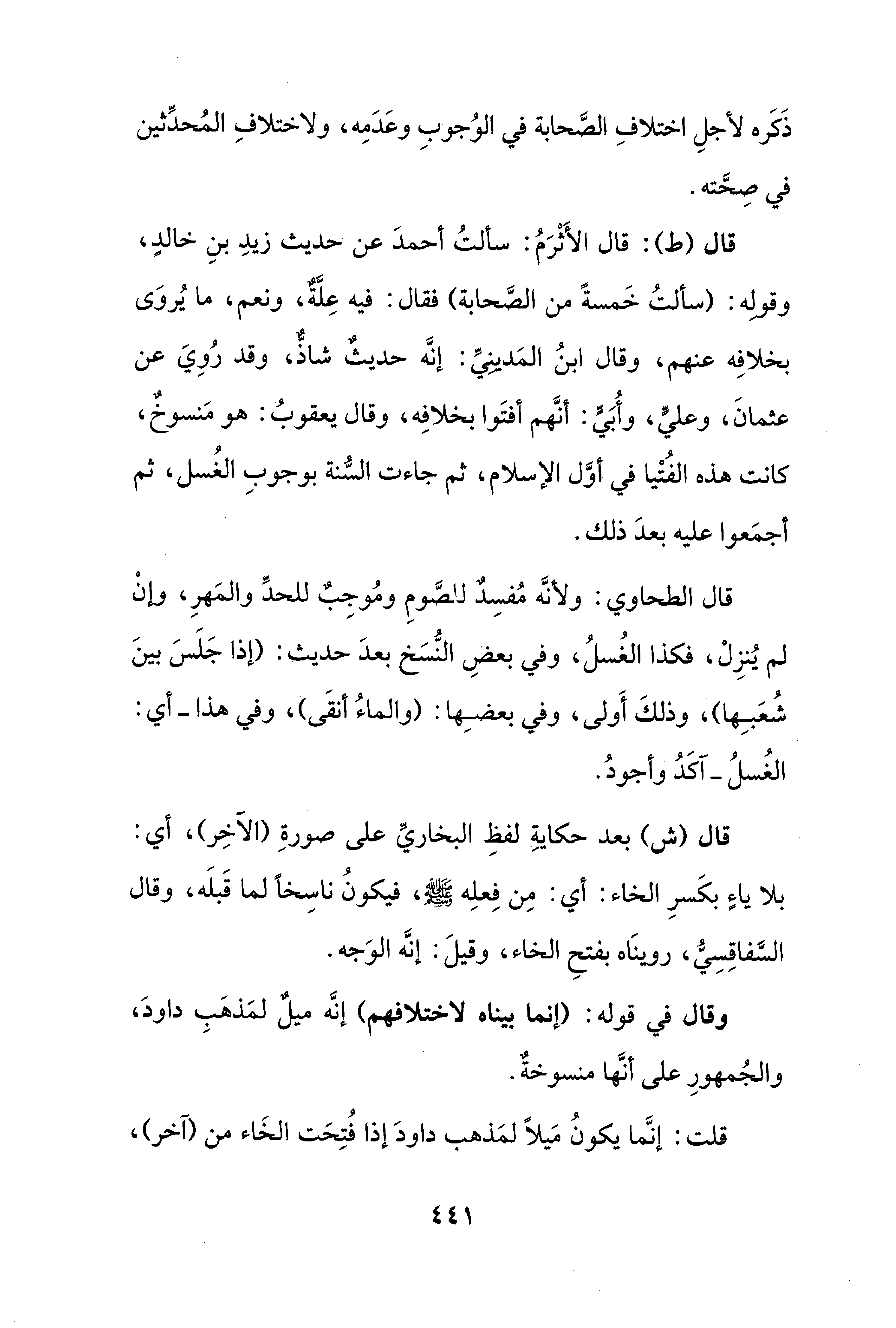 قال (ط): قال الأَثْرَمُ: سألتُ أحمدَ عن حديث زيدِ بنِ خالد، وقوله: (سألتُ خَمسة من الصَّحابة) فقال: فيه عِلَّةٌ، ونعم، ما يُروَى بخلافِه عنهم، وقال ابنُ المَديني: إنَّه حديثٌ شاذٌّ، وقد رُوِيَ عن عثمانَ، وعلي، وأُبَيٍّ: أنَّهم أفتَوا بخلافِه، وقال يعقوبُ: هو مَنسوخ، كانت هذه الفُتْيا في أوَّل الإسلام، ثم جاءت السُّنة بوجوبِ الغُسل، ثم أجمَعوا عليه بعدَ ذلك.