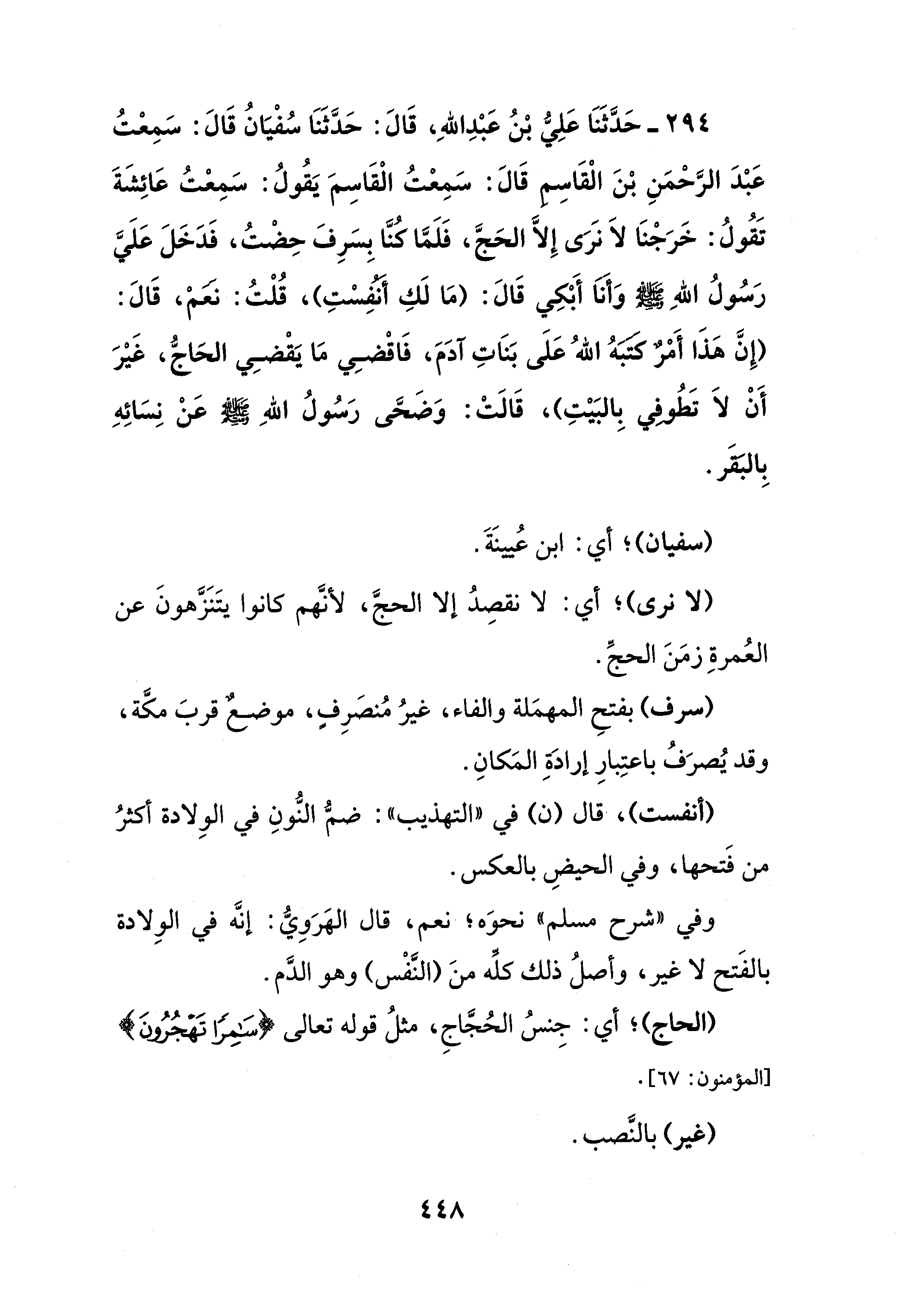 294 - حَدَّثَنَا عَلِيُّ بْنُ عَبْدِ اللهِ، قَالَ: حَدَّثَنَا سُفْيَانُ قَالَ: سَمعتُ عَبْدَ الرَّحمَنِ بْنَ الْقَاسِمِ قَالَ: سَمعتُ الْقَاسِمَ يَقُولُ: سَمعتُ عَائِشَةَ تَقُولُ: خَرَجْنَا لاَ نَرَى إِلَّا الحَجَّ، فَلَمَّا كُنَّا بِسَرِفَ حِضْتُ، فَدَخَلَ عَلَيَّ رَسُولُ اللهِ - صلى الله عليه وسلم - وَأَناَ أَبْكِي قَالَ: (مَا لَكِ أنُفِسْتِ)، قُلْتُ: نعم، قَالَ: (إِنَّ هَذَا أمرٌ كتبَهُ اللهُ عَلَى بَنَاتِ آدَمَ، فَاقْضِي مَا يَقْضِي الحَاجُّ، غَيْرَ أَنْ لاَ تَطُوفي بِالبَيْتِ)، قَالَتْ: وَضَحَّى رَسُولُ اللهِ - صلى الله عليه وسلم - عَنْ نِسَائِهِ بِالبقَر.